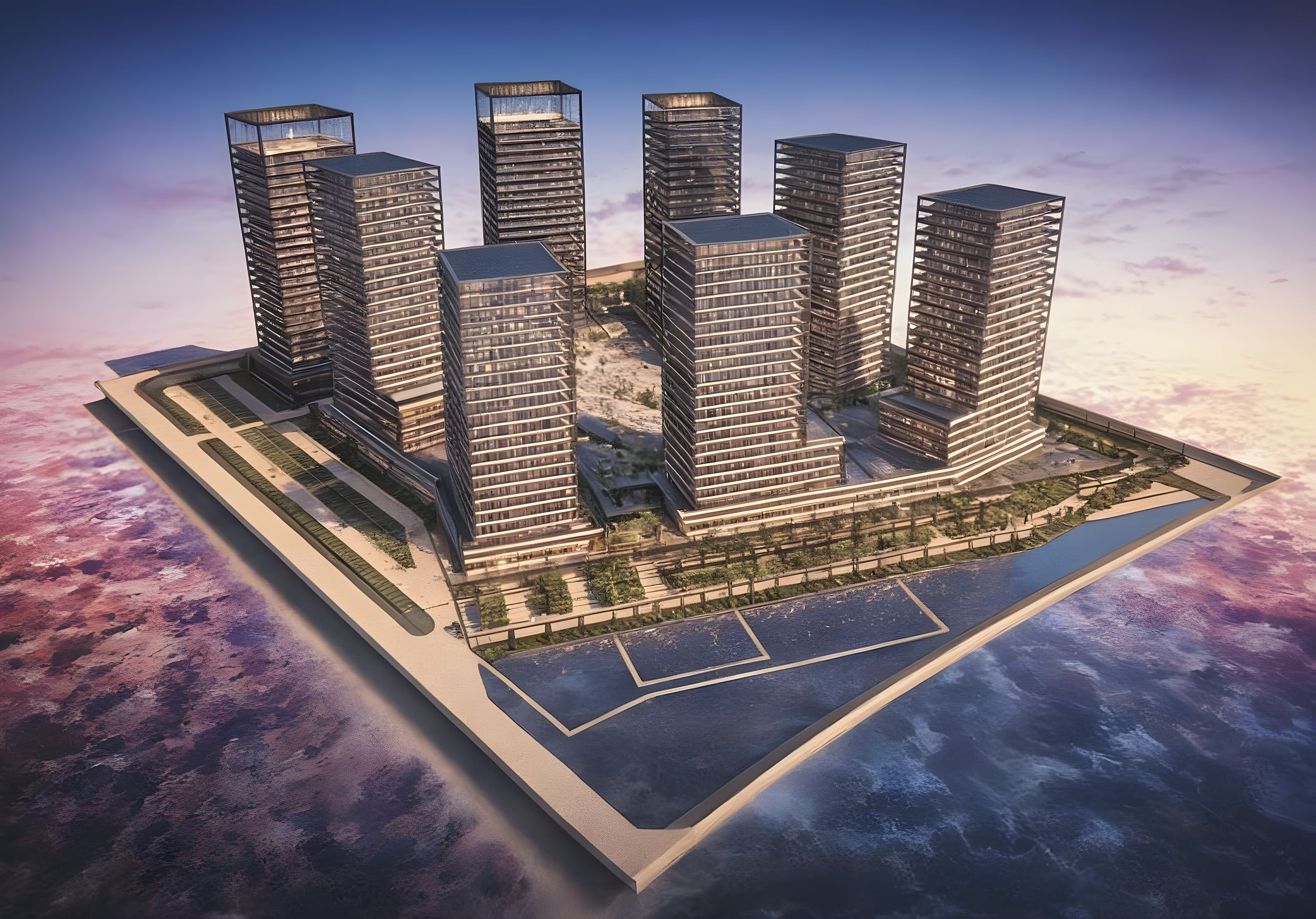 PromptPhoto of a modern urban residential complex featuring several tall skyscrapers with sleek glass facades and vertical lines. Surrounding elements include a landscaped plaza with green spaces and parking areas. The scene is set during golden hour, casting warm natural light and soft shadows that enhance the building textures. Captured from a high-angle perspective with a wide-angle lens, showcasing the entirety of the architectural layout and its integration within the urban landscape.