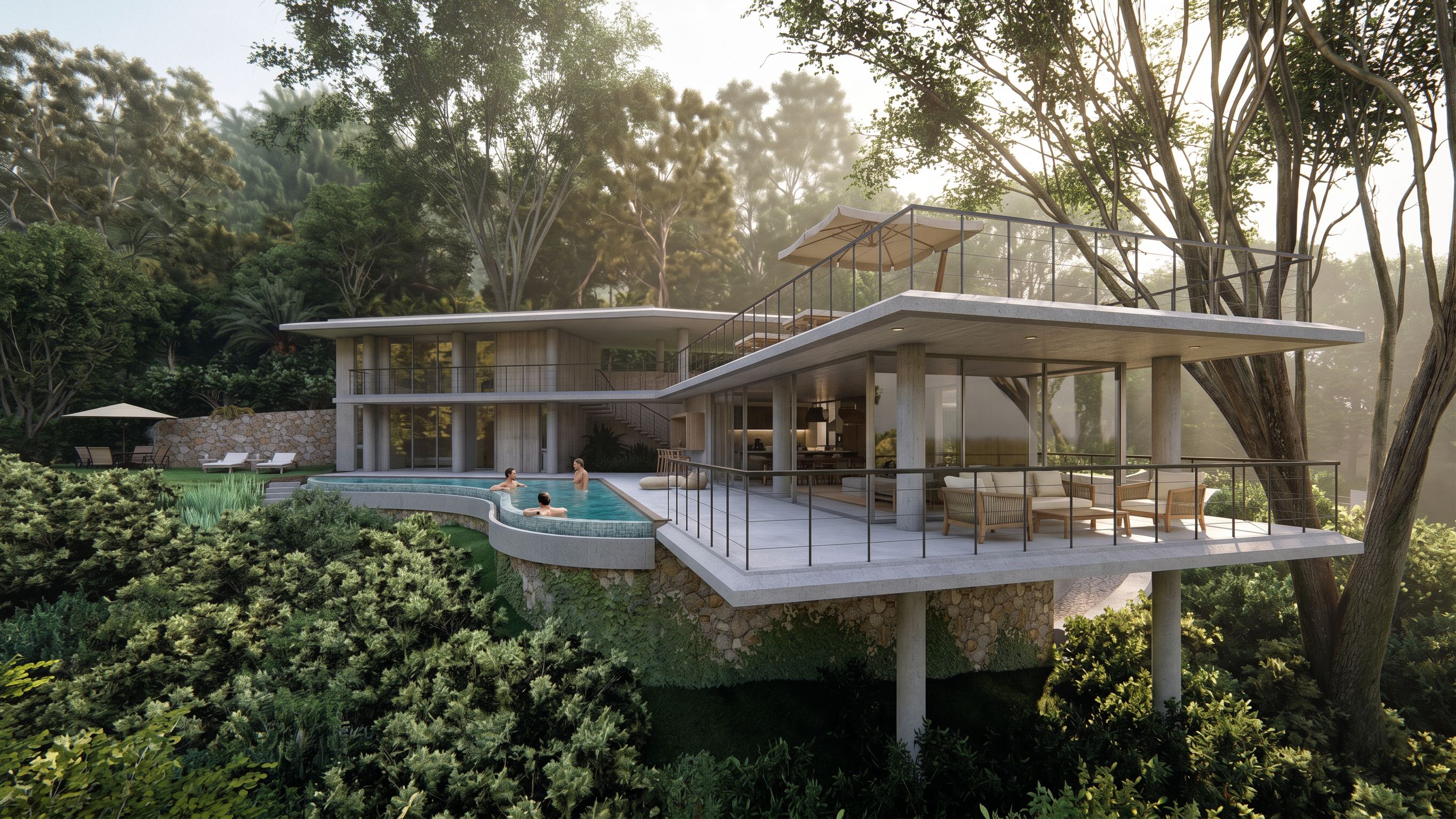 super beach house . people in the pool, keep exact camera angle