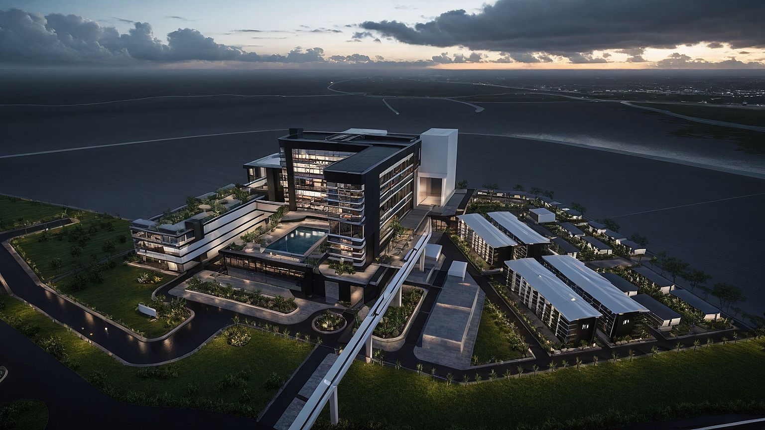 Heavy overcast with rain + sunset + Additional vegetation + Modern building facades + Steel black and concrete finish + lighting + sky rail colour white + detailed grass + white sails for structures