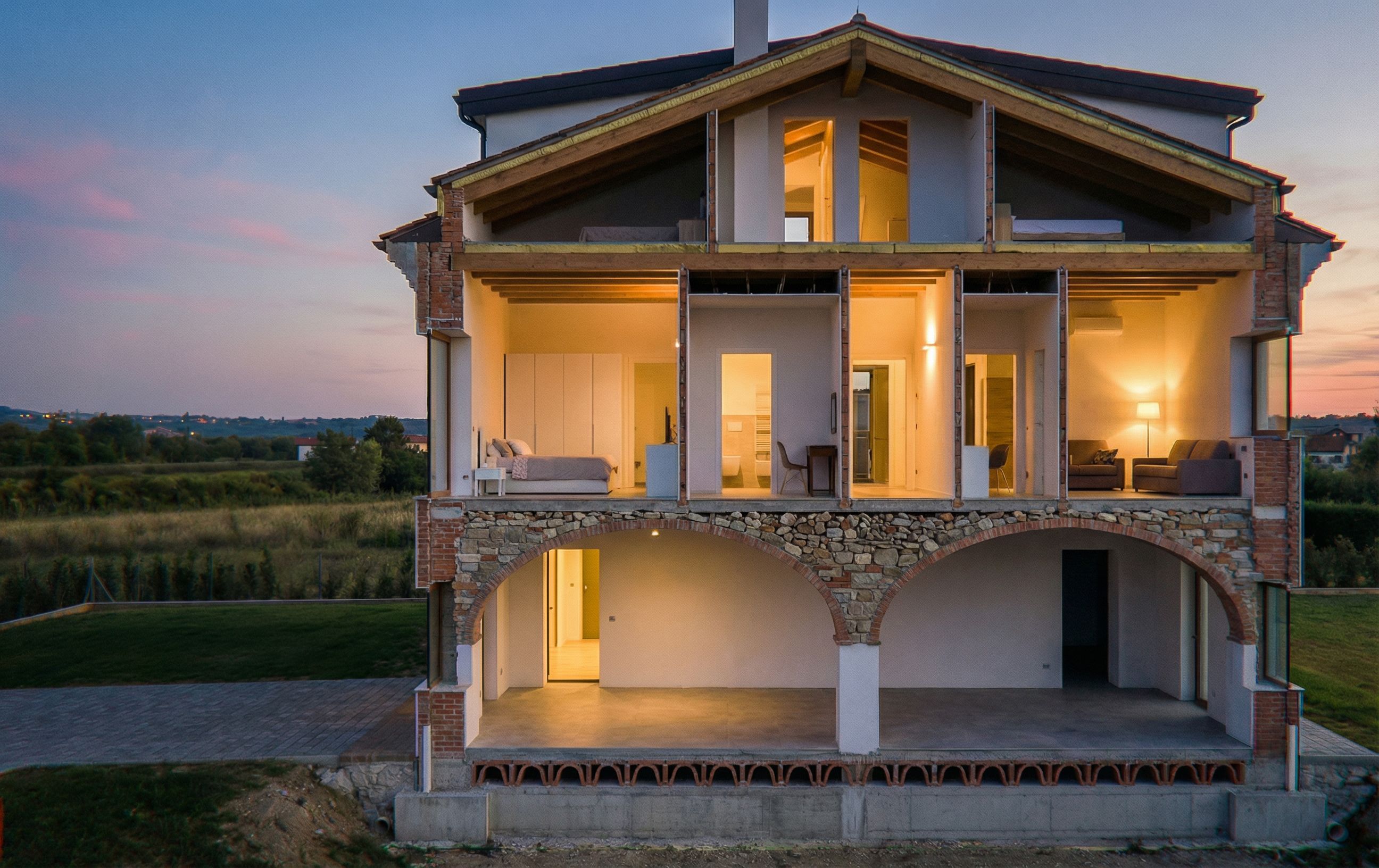 Remove the modern building on the left from this image. Replace the red bricks of the exterior sectioned walls with rubble masonry, using a mix of stone and brick. Replace the stone wall on the ground floor, under the vaults, with white plaster. Fill the space between the vaults and the first-floor attic with stones and small debris., keep exact camera angle