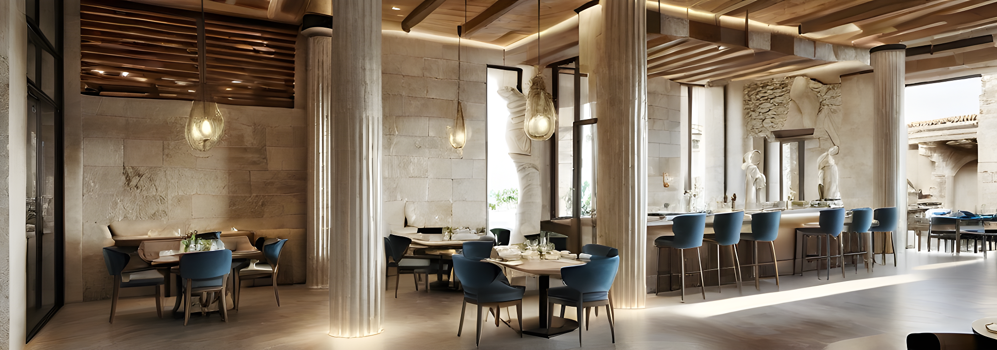 PromptCreate a realistic render of a modern restaurant with Greek architectural style, featuring Roman or Greek columns and ancient ruin-like walls combined with glass elements, as if emerging from Poseidon’s ruins. Use sleek, modern furniture and Greek statues for decor. The design should blend ancient elegance with contemporary luxury. The predominant texture should be microcement