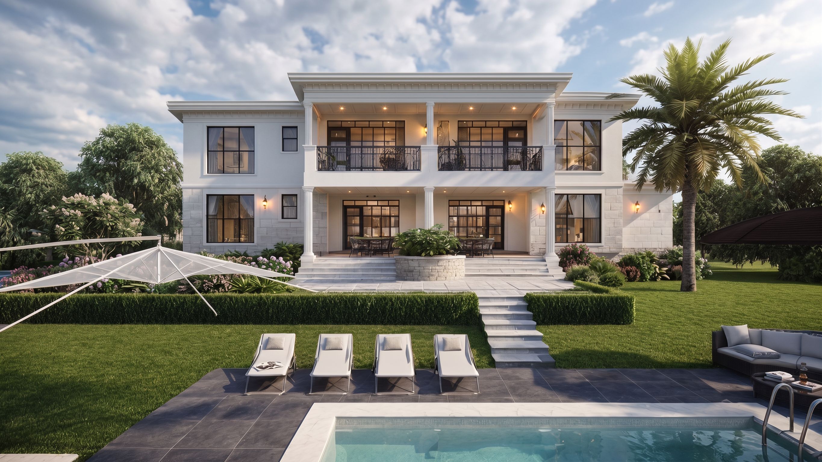 PromptCreate a daytime, photorealistic exterior architectural render based on the attached reference image. Exterior wall lights and balcony soffit downlights are switched on, emitting a warm glow that contrasts subtly with the daylight, while interior lighting is faintly visible through the glazing for depth. Keep the exact camera angle., keep exact camera angle