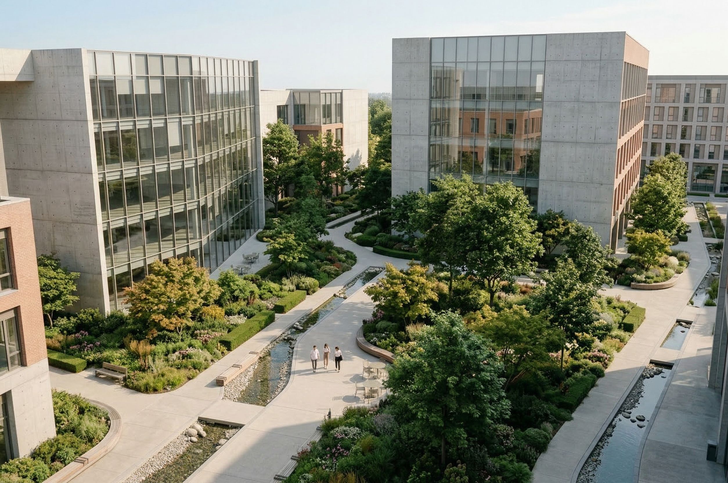 preserve original geometry exactly, do not change massing, proportions, layout, or building footprints, no deformation, no added architectural elements use reference images only for landscape style, planting density, water integration, and lighting, do not copy architectural forms slightly elevated aerial view of a contemporary architectural site, not too high, maintaining a close connection to human scale while clearly showing the relationship between buildings, paths, and landscape buildings use exposed concrete, large glass surfaces, and subtle terracotta brick accents, consistent and minimal material palette emphasize integration of landscape and architecture, with lush, layered vegetation filling the spaces between buildings and following the curved paths introduce soft, continuous planting zones with a mix of trees, shrubs, and groundcover, inspired by the reference images, creating a cohesive green network throughout the site add subtle water elements integrated along the paths or within landscape pockets, calm and natural, enhancing environmental quality without dominating the composition paths remain clearly defined and smooth, highlighting circulation and movement through the site trees are intentionally placed to frame spaces, guide circulation, and create shaded areas between buildings include a few people visible from above, walking along paths, reinforcing scale and use lighting is warm daylight with soft shadows, enhancing depth and texture of the landscape overall composition reads as a unified system where buildings and landscape are fully integrated, creating a calm, intentional, and human-centered environment *PRESERVE GEOMETRY GIVEN*, keep exact camera angle