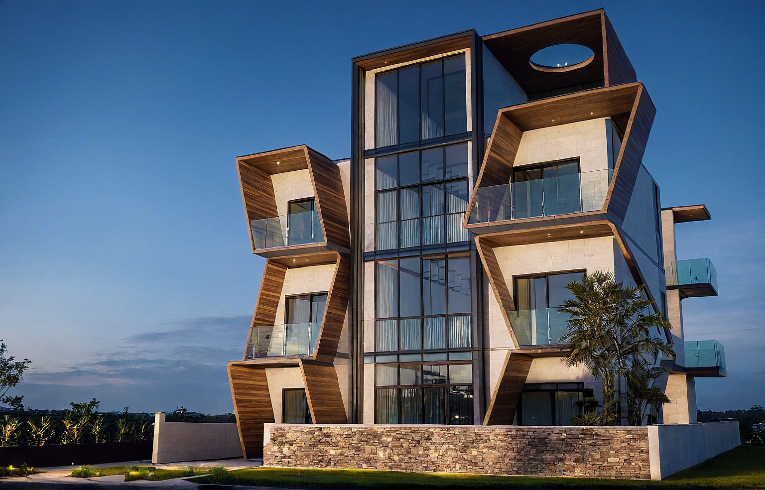 Photo of a modern residential building featuring sleek lines and multiple balconies. Emphasize the textured stone façade, large glass windows, and wooden accents that create a harmonious blend of materials. Surrounded by a landscaped garden with lush greenery, the structure stands against a night setting with artificial lighting illuminates the scene, casting gentle shadows that enhance the architectural details. Captured from a low-angle perspective to highlight the height and dynamic design, using a wide-angle lens for a broad view of the surroundings.