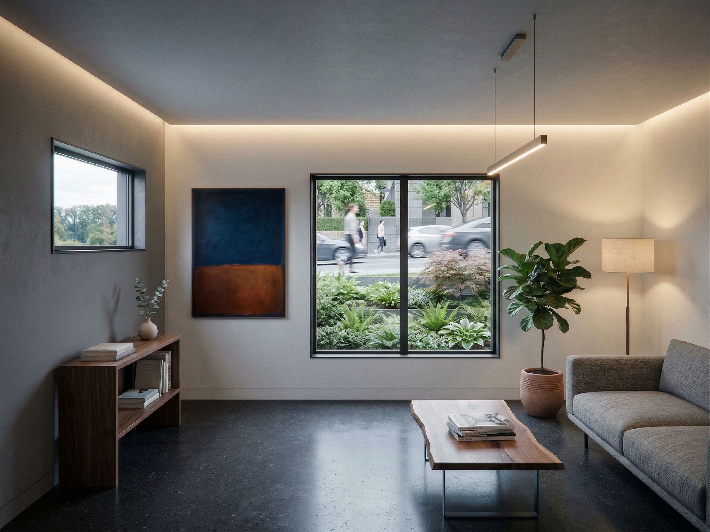 Promptlooking out window to sunken garden with people and cars 30 feet away at sidewalk beyond, no stairs, reuse with one 5 foot x 5 foot window to the right, keep exact camera angle