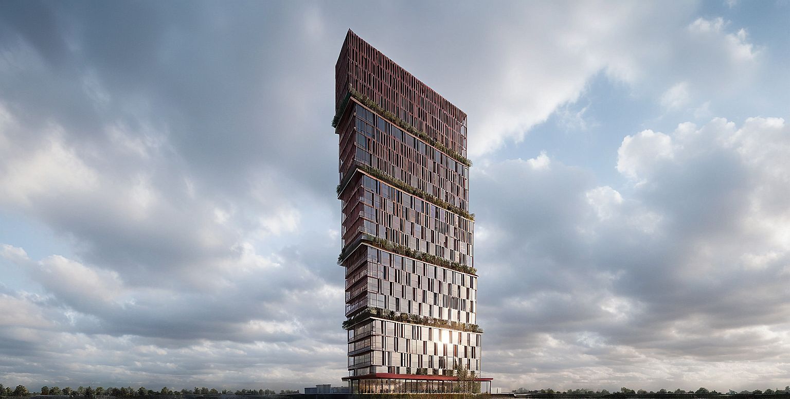 Create a conceptual rendering of a slender, monolithic skyscraper with a sculptural, staggered massing that gradually shifts as it rises. The facade features a rich reddish-brown cladding with a dense grid of square windows, giving the tower a pixelated yet elegant texture. The base of the building is elevated on angled pilotis, creating a transparent ground level that connects to a reflecting pond. Surround the tower with soft mist, a reflective water surface, and subtle natural elements like trees and a swan to emphasize contrast between the built form and the organic context. Use a moody sky with dramatic light filtering through the clouds to enhance the architectural presence and evoke a cinematic atmosphere.