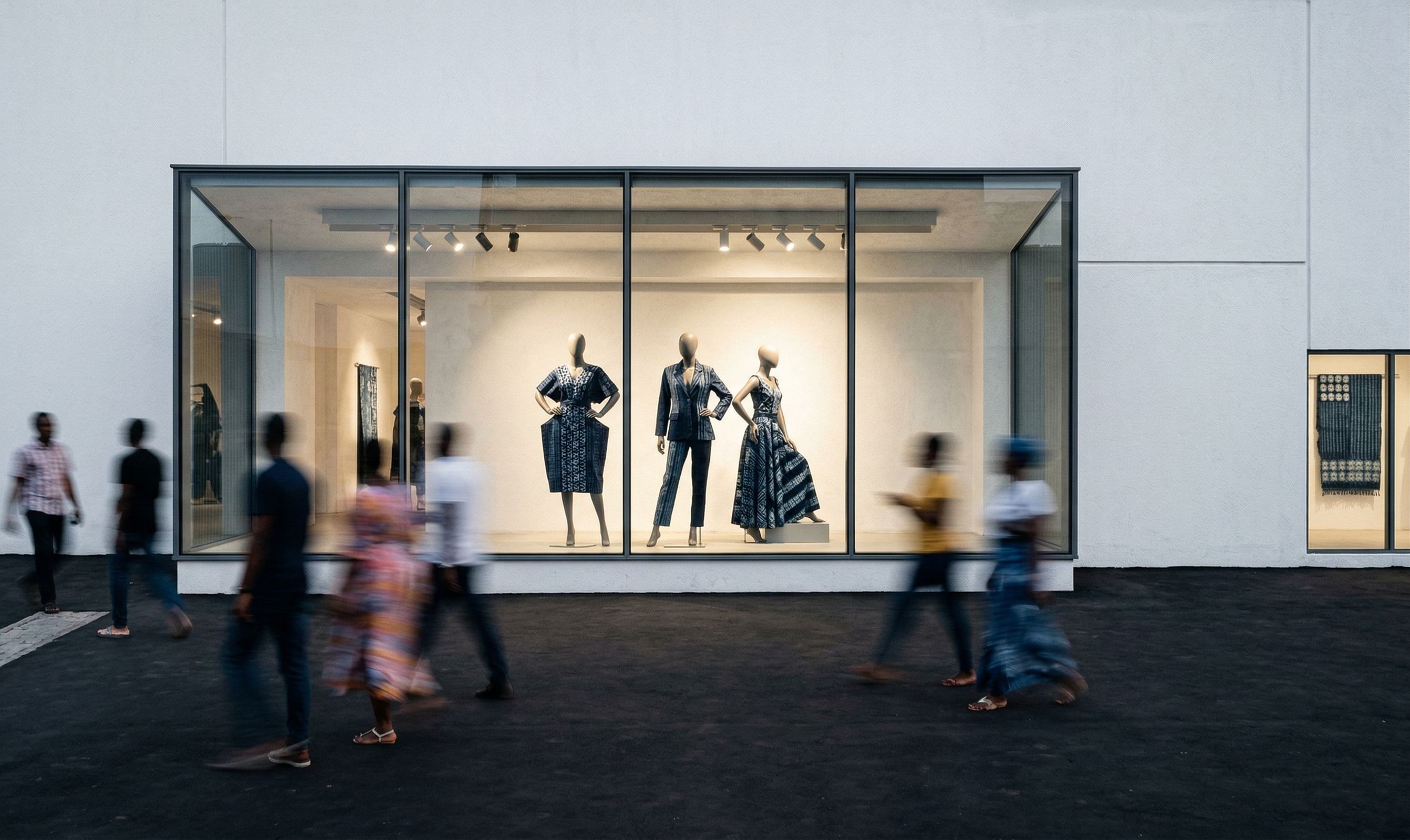 External vitrine showcase, with a creatively adire clad mannequin inside, track lights beaming on the display, clean and sophisticated, people passing by in long exposure, 4k, realistic view, plexiglass, lighting , keep exact camera angle