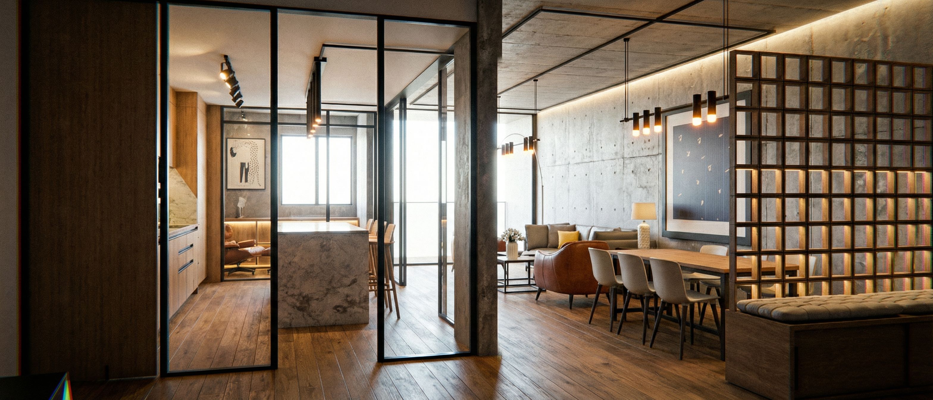 PromptEstilo industrial, no cambies distribución, suelo madera medio, muros grises hormigón visto , cocina de robe, chic, elegante arquitectónico , keep exact camera angle