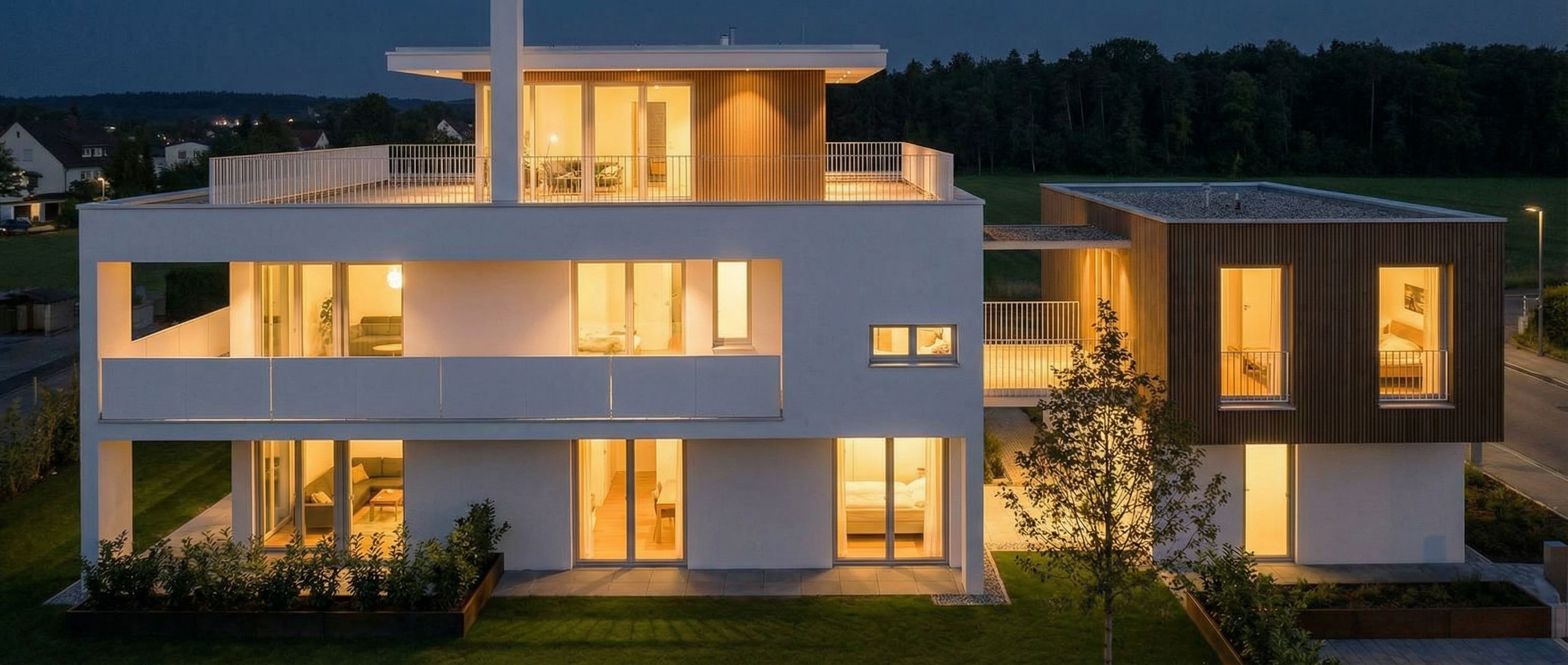 architectural sketch, render this drawing into photorealistic rendering, Photo of a modern residential building featuring sleek, minimalist design elements but a white panel-reeling on the balcony in first floor, with large glass windows also on the wodden cube and horizontal wooden slats. Set within a suburban landscape, the home is surrounded by green space and manicured lawns. Natural morning light casts soft shadows on the façade, highlighting the interplay of textures between smooth concrete and warm wood. Captured from a slightly elevated angle to emphasize the building's lines and proportions, an ultra-wide lens enhances its presence against the backdrop of a forest with large trees and the clear sky., wide establishing shot, night scene with ambient lighting, including detailed elements, high quality, professional, detailed scene