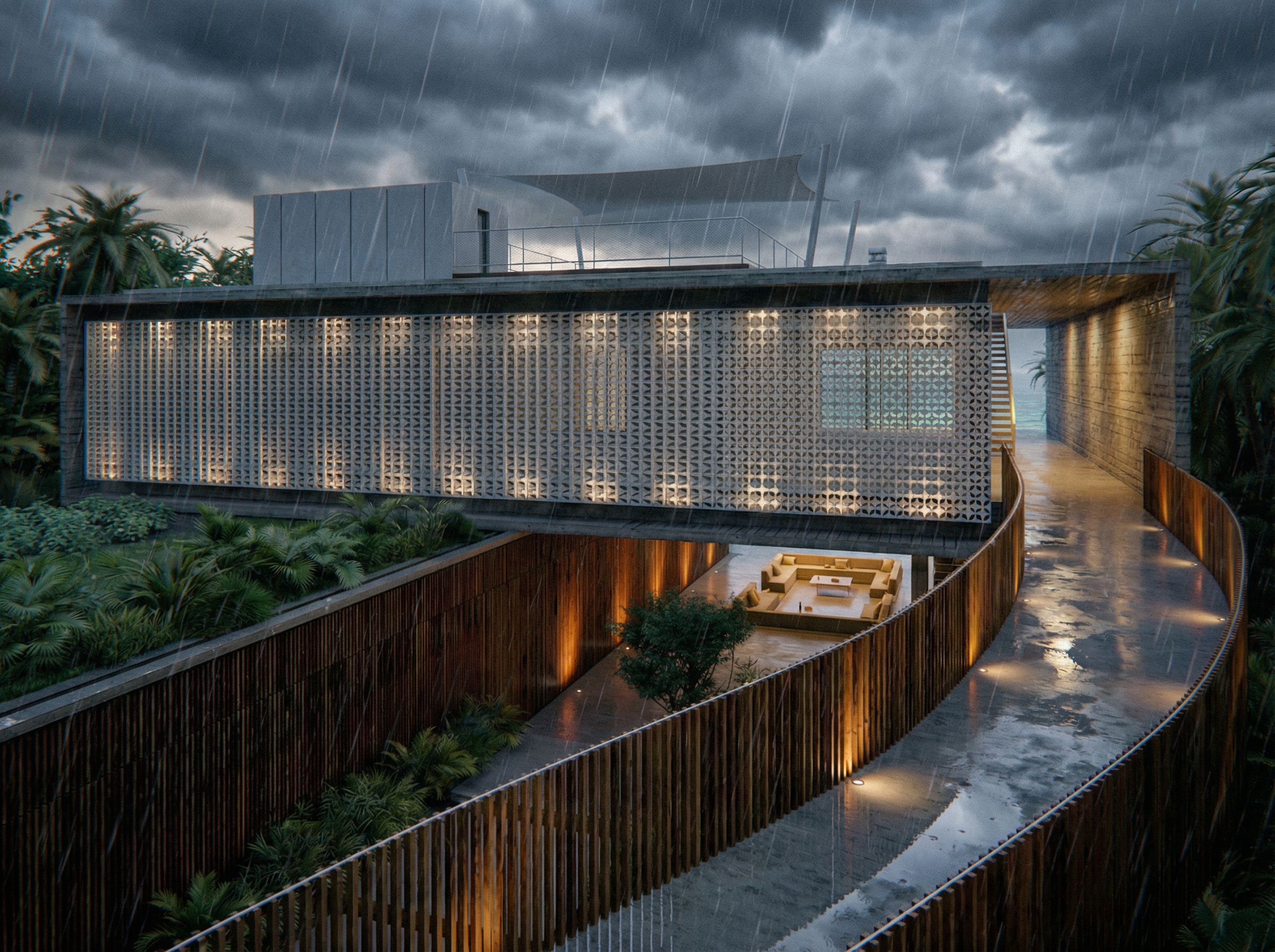 añade nubes dramáticas de tormenta y lluvia fuerte de un día invernal con los suelos mojados y reflejos en pequeños charcos. enciende las luces del pasillo., keep exact camera angle
