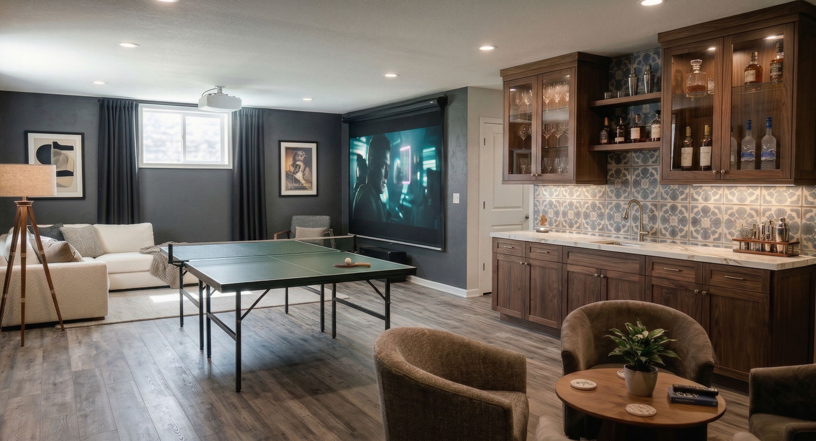 Promptmove the ping pong table to the left more to give the bar area more space, keep exact camera angle