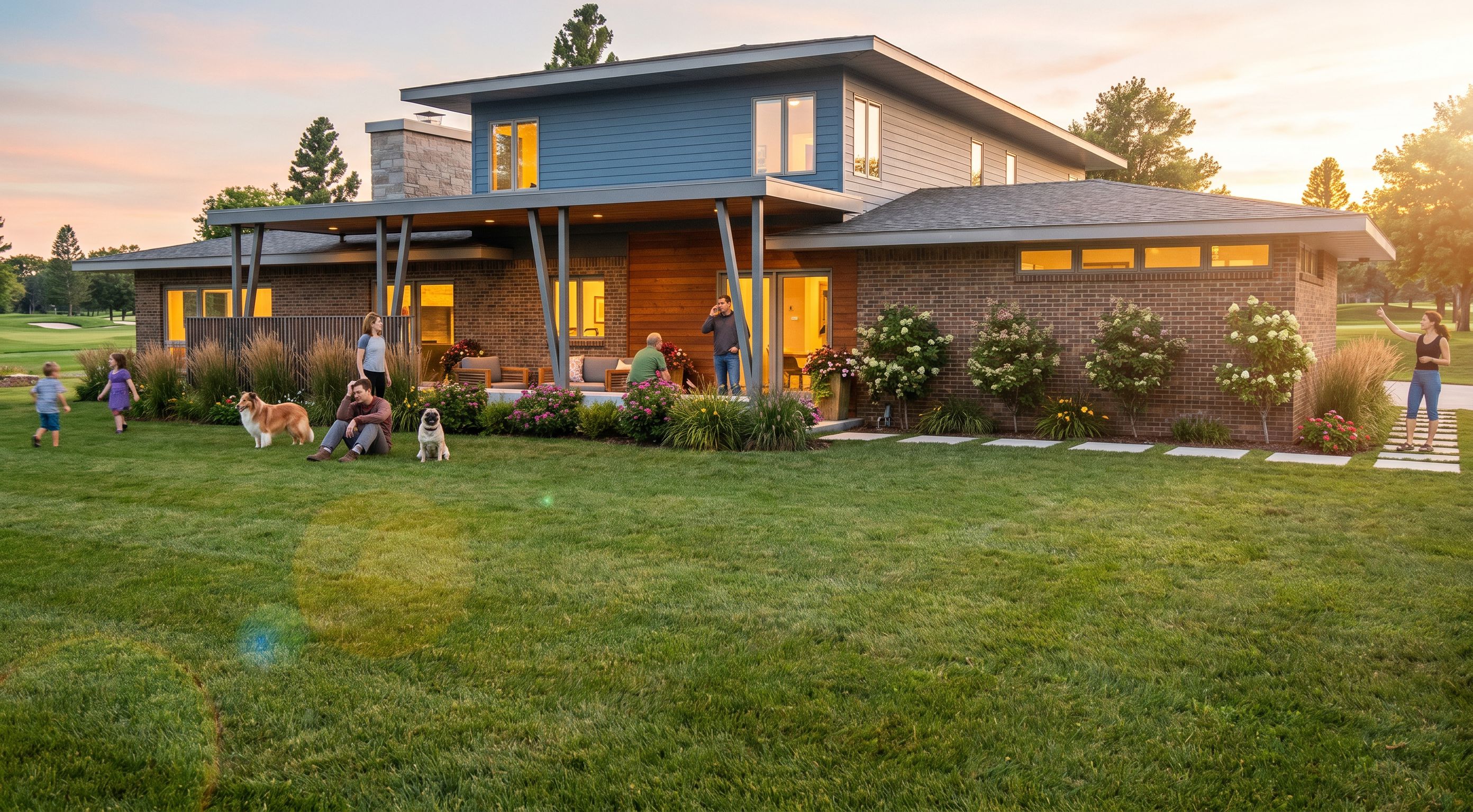 PromptPhoto of a contemporary single-family home nestled in a lush, blue lap siding green landscape. Highlight the warm wooden elements, clean lines, and modern textures. The inviting porch features stylish outdoor seating surrounded by carefully manicured gardens and native trees. Natural sunlight casts soft shadows, creating a serene atmosphere during golden hour. Capture the scene from a slightly elevated angle, using a wide-angle lens to encompass both the home and its vibrant surroundings, enhancing the spacious feel of the property. Asphalt shingle grey roof. Metal V colums grey, golf coarse in background behind houses. add interior lighting and girls and boys