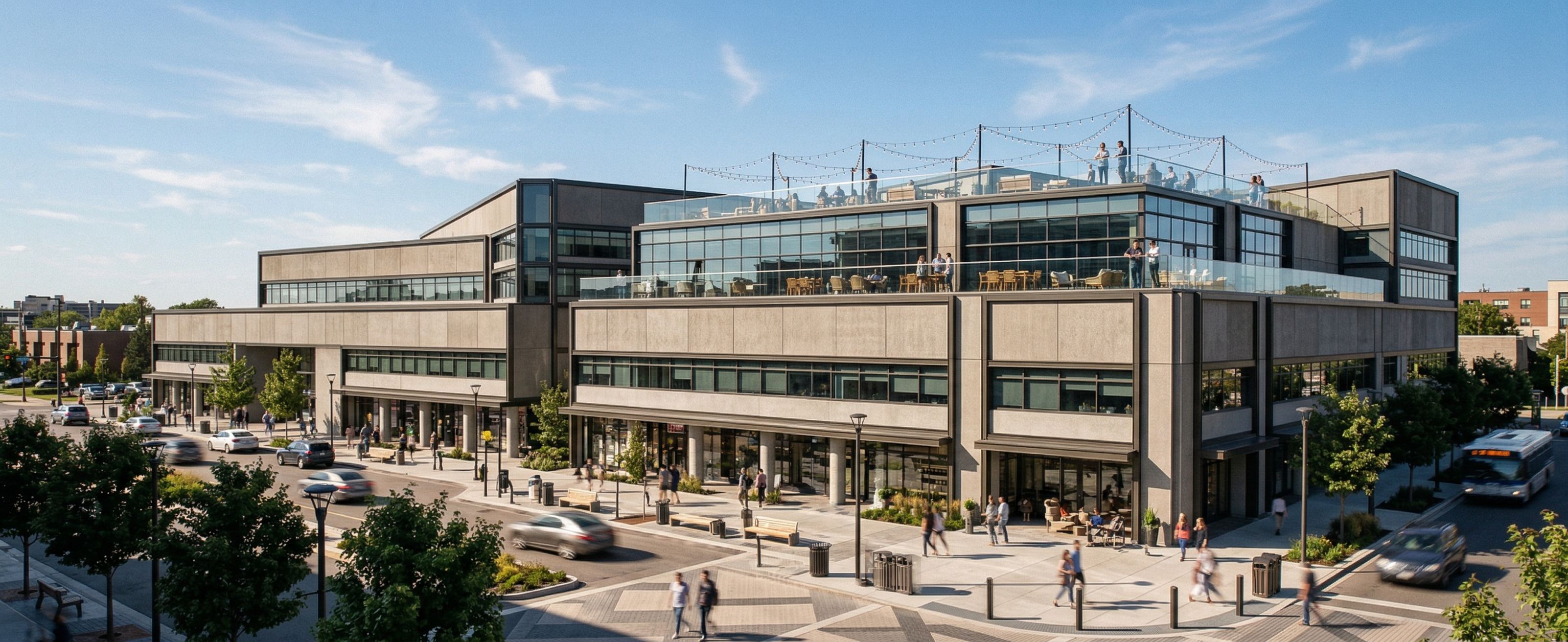 Prompt6 story building rooftop patio with tables, chairs, string lights, people sitting and standing, clear railing on roof edge , keep exact camera angle
