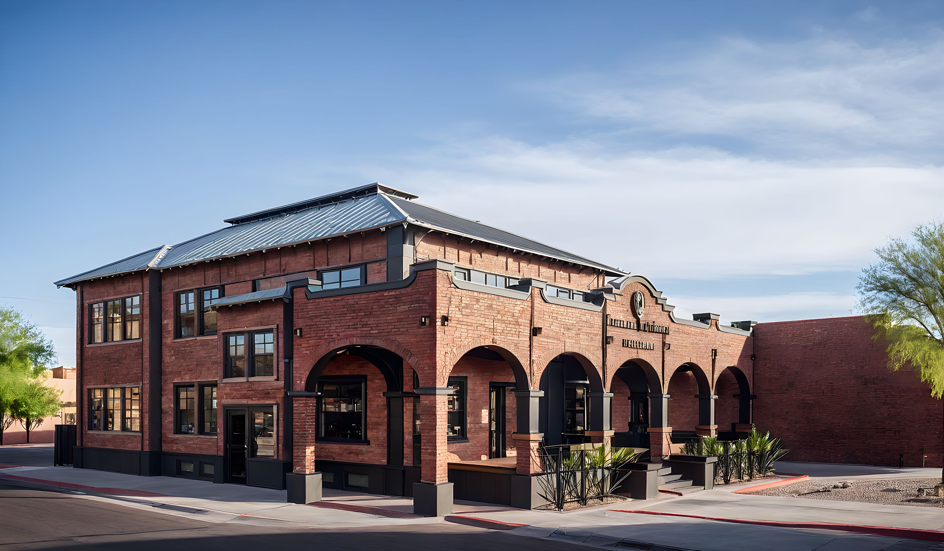 PromptModern restaurant in downtown Phoenix, Arizona, historical neighborhood, Lysaght metal roof, exposed brick exterior wall.