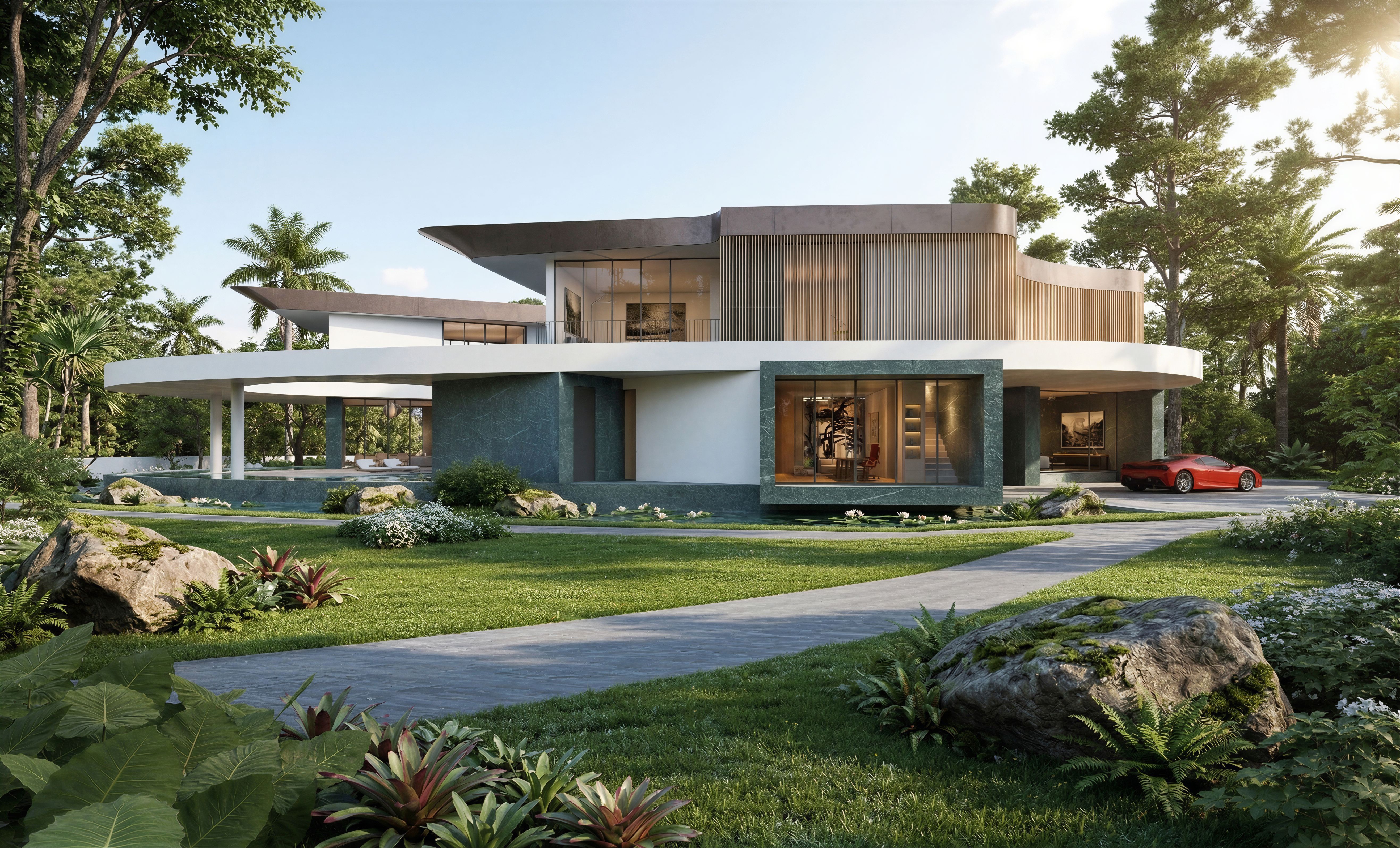 EnhancedPromptPhoto of an ultra minimal luxury villa, showcasing sleek curved off white and dark greenish gray stone architectural elements with large glass windows, natural wood accents and Brown-grey metallic roof edge. Surrounded by a tropical lush green lawn, boulders, and tall trees, integrating with the tropical landscape. The bright afternoon sun casts soft shadows, enhancing the textures of the materials. Captured from a low angle to emphasize the building's dynamic forms and the interplay of light, using a wide-angle lens for a sense of grandeur and openness., keep exact camera angle, keep exact camera angle, keep exact camera angle