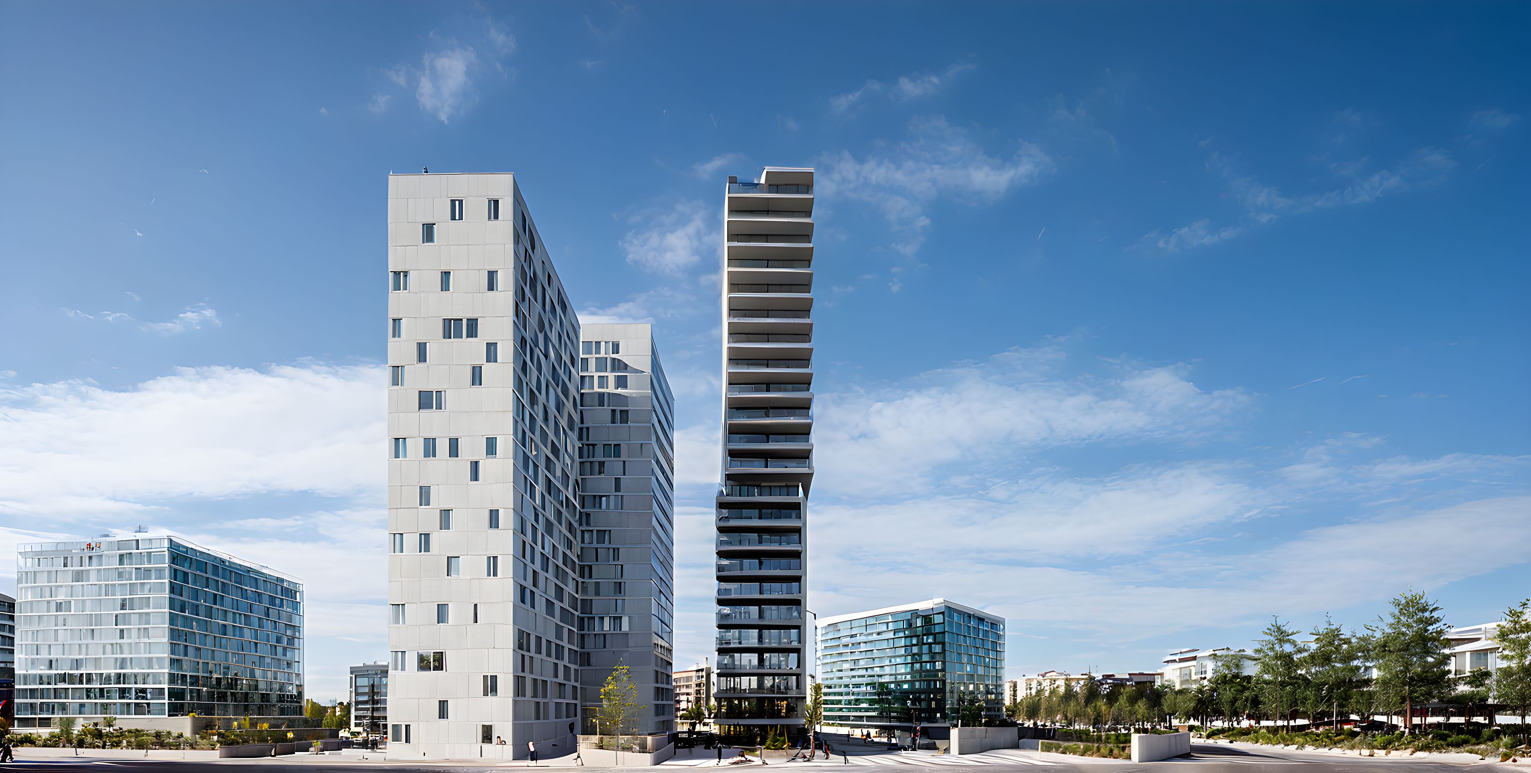 Prompt"Modern residential tower with a cantilevered design — lower part made of solid gray concrete with square grid windows (5 floors), upper structure narrower and offset, finished in white facade panels and wooden accents, featuring aligned balconies with glass railings. Scene includes active ground floor with cafes, outdoor seating, and pedestrians. Urban-natural setting with pine trees, shrubs, rocky foreground path, and modern background buildings. Daylight with clear skies, soft shadows, and a sense of vibrant public life. Include people walking, cycling, and sitting; realistic textures (glass, concrete, metal), and landscaping integration. Foreground stairs lead down to street-level plaza."