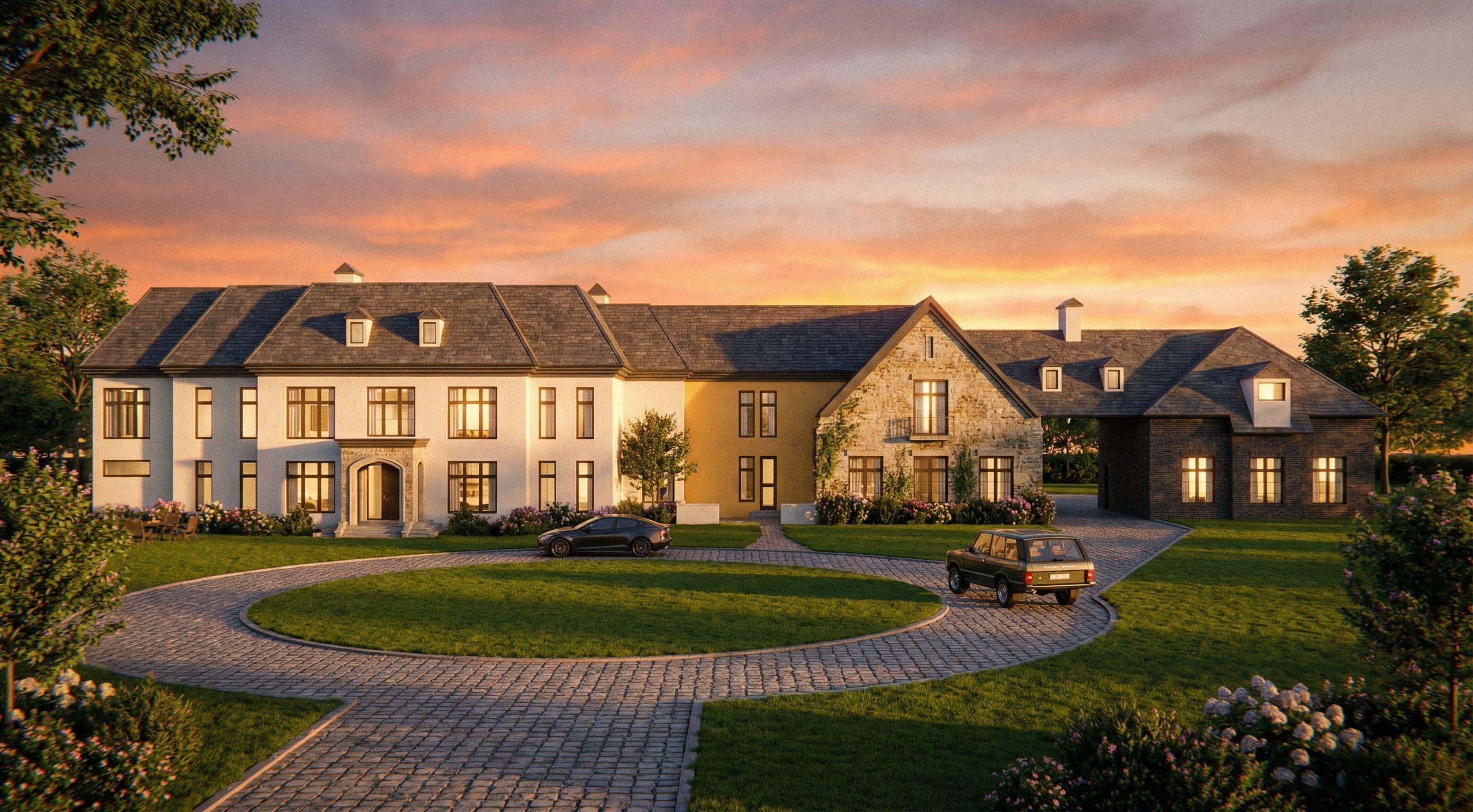 Photo of an elegant residential estate featuring a mix of contemporary and traditional design elements. Focus on the intricate façade with varied textures, including stone, brick, and smooth stucco. Nestled in a landscaped area, the round driveway enhances the grandeur. Natural light casts soft shadows, capturing the time of day just before sunset. Perspective from a low angle, using a wide lens to highlight the height and detail of the structure, while framing the surrounding greenery and subtle architectural accents., keep exact camera angle