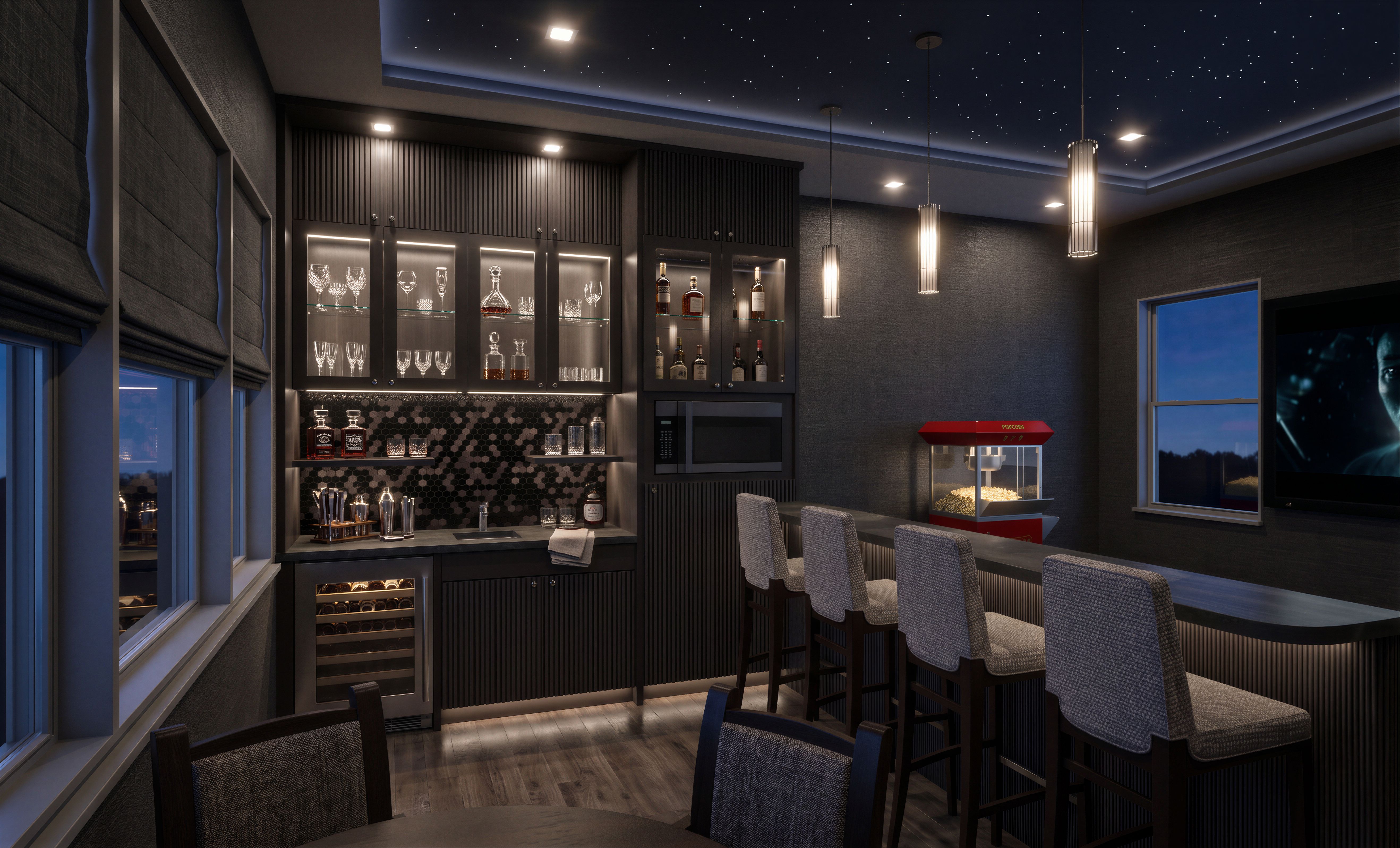 Make photo-realistic rendering of this media room; Add wall design as appropriate for a media room and trending now; Add night sky ceiling design as appropriate for a media room and trending now; Add colors as is a trend now for a media room; Picture right of the back window is a projection screen; Add light fixtures as appropriate, light fixtures on; Add appropriate items to the current wet bar cabinets; There is more glassware than bottles in the glass door cabinets; Keep the current backsplash design, just make it photo-realistic; Keep the current cabinet hardware design, just make it photo-realistic; Glassware on glass shelves above the countertop; There is a popcorn machine next to the existing window; Windows have blinds as appropriate for a media room; Only skies are seen through the windows; Empty wall spaces stay solid, add texture design as appropriate into empty walls, but no new windows; No added windows, no added openings, no added glazing; No added windows, no added openings, no added glazing;, keep exact camera angle