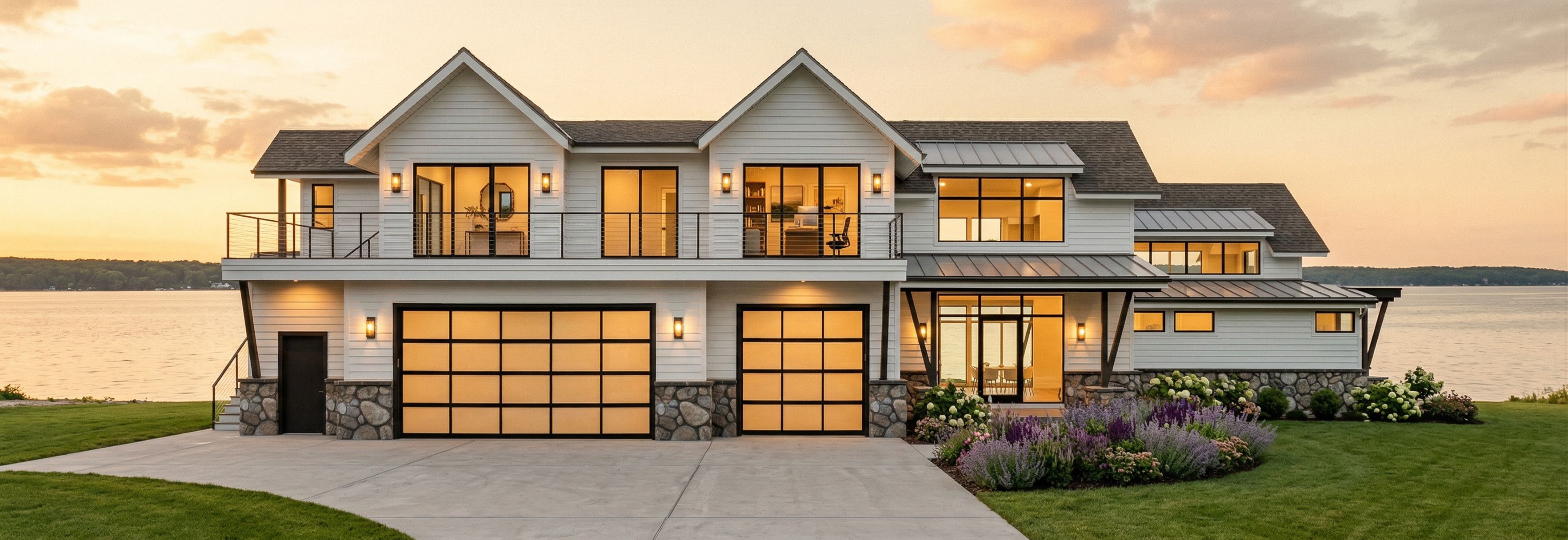 Make photorealistic rendering of the house, add lake view in the background per Reference Image 1, replace light brown gravel space with flower bed, lawn in the front, clean bright white mitered lap siding per Reference Image 2, exterior lights on, light in the interior rooms, room with gable roof on the left above the garage is entry room, no bed in that room room with gable roof on the right above the garage is office, no bed in that room keep exact camera angle, keep exact camera angle