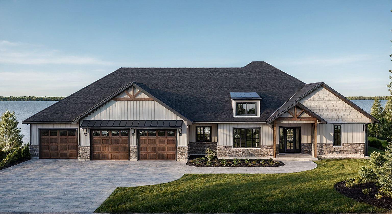 PromptAdd lots of landscaping and a lake in the back ground with lots of trees, only do garage door windows at the very top