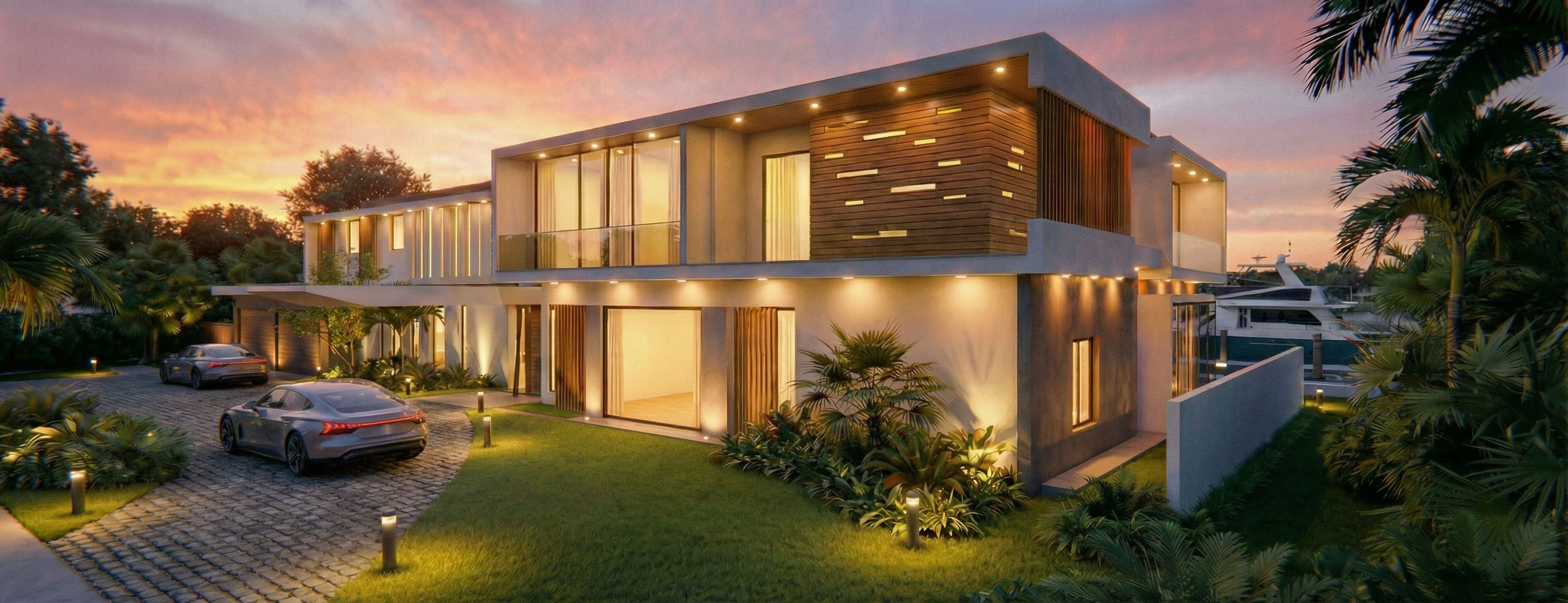 Promptagregar dos aurdi sr7 uno en la mitad del driveway y el otro al fondo en frente del garage. eliminar el vidrio del balcon de la esquina derecha. disminuir mas el tamano de las luminarias redondas de los techos, keep exact camera angle