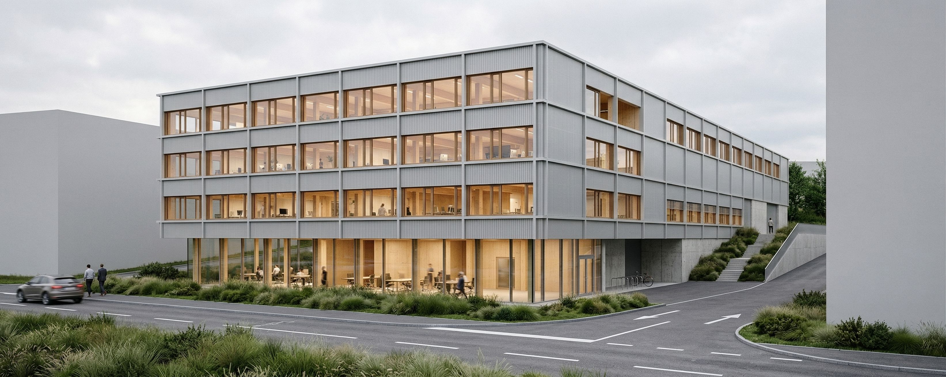 Erstelle eine hochwertige Architekturvisualisierung. Behalte dabei unbedingt die Geometrie und Perspektive aus dem importierten Bild bei. Die horizontalen und vertikalen Lisenen sollen aus mattem hellgrauen Metall sein, die zwischenräume mit gelochten hellgrauen Wellblech. Fenster in Holz. Es gibt keine Loggia oder ähnliches, nur normale Fenster. die fensterteilung soll übernommen werden. der innenbereich soll warm erscheinen mit viel holzbau und büro. Achte darauf dass die Freiraumgestaltung sich genau an das importierte Bild hält. die grauen Bereiche sollen Straße werden, die grün dargestellen bereiche sollen schön bepflanz sein mit niedrigen bis mittelhohen Gräsern. auf der Straße im Vordergrund soll straßenmarkierungen hinzugefügt werden,
