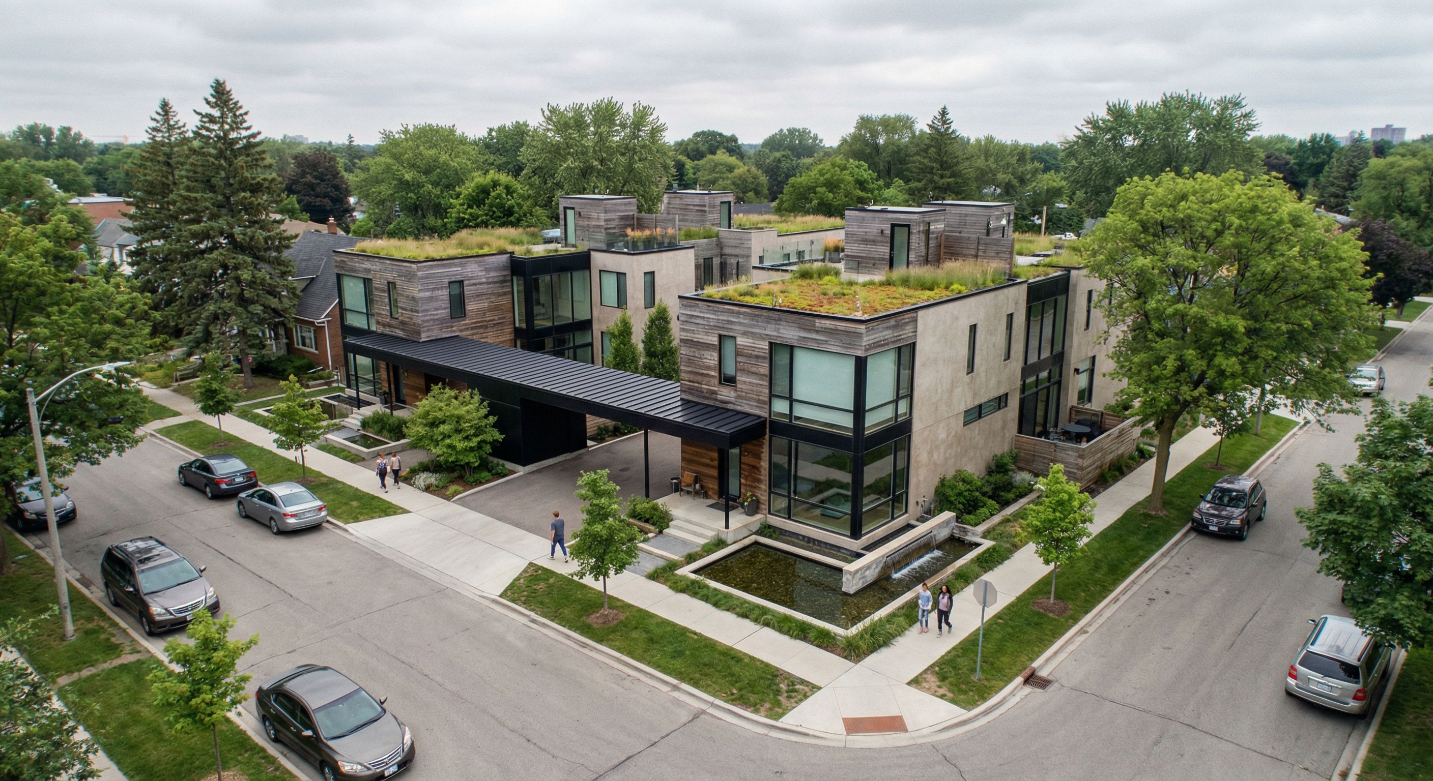 keep front elevation view with suburban housing mature trees in background front street corner close to house units with cars parked at street