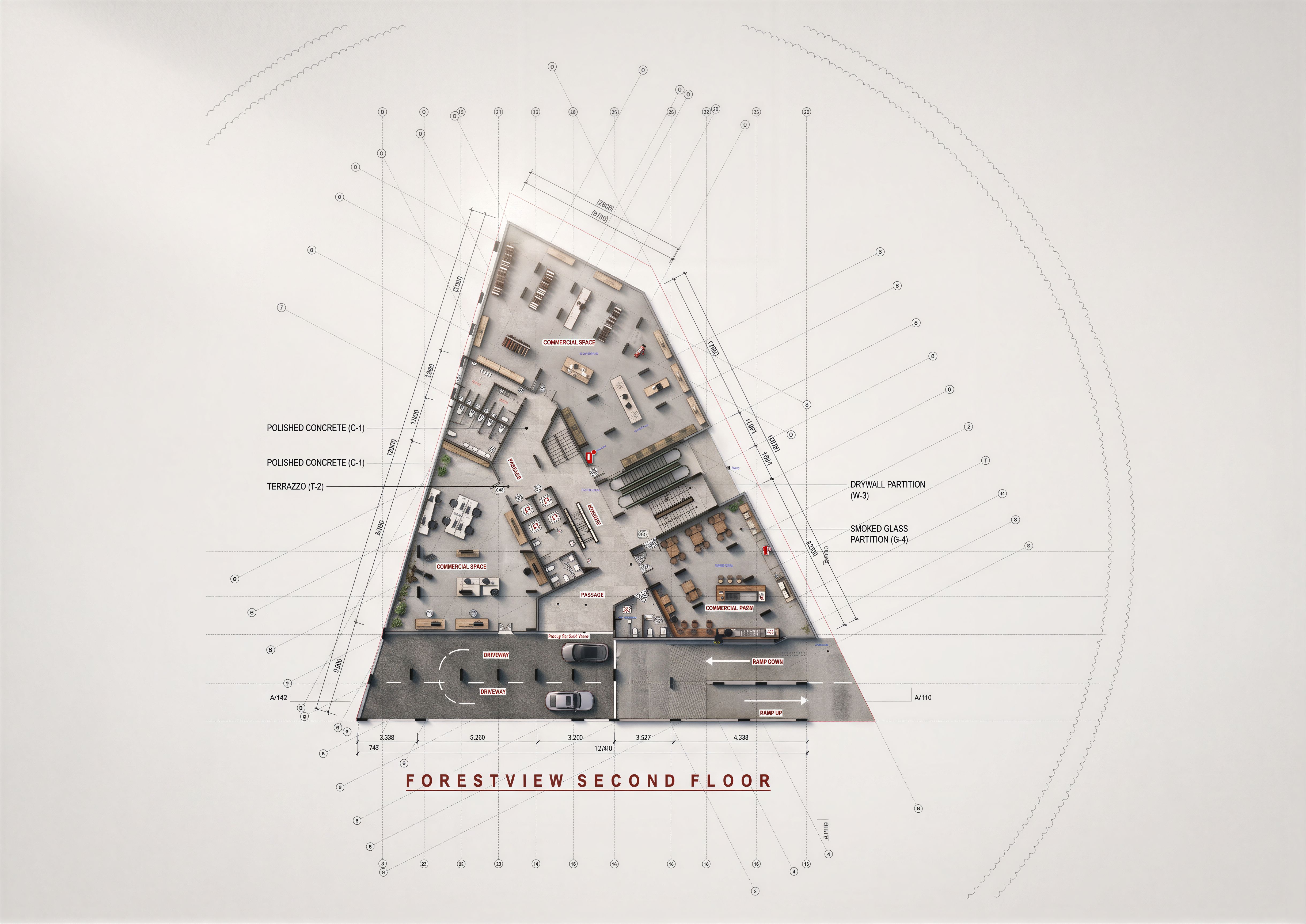 PromptLAYOUT SHOWING A COMMERCIAL FLOOR WITH SHOPS AND LARGE COMMERCIAL SPACES, CIRCULATION SPAces and washrooms. ACCESS RAMPS. CLEARLY INDICATE PARTITIONS AND ANNOTATIONS. MAKE IMAGE HIGH RESOLUTION 8K. MAKE LAYOUT HIGH RESOLUTION AND REALISTIC., keep exact camera angle