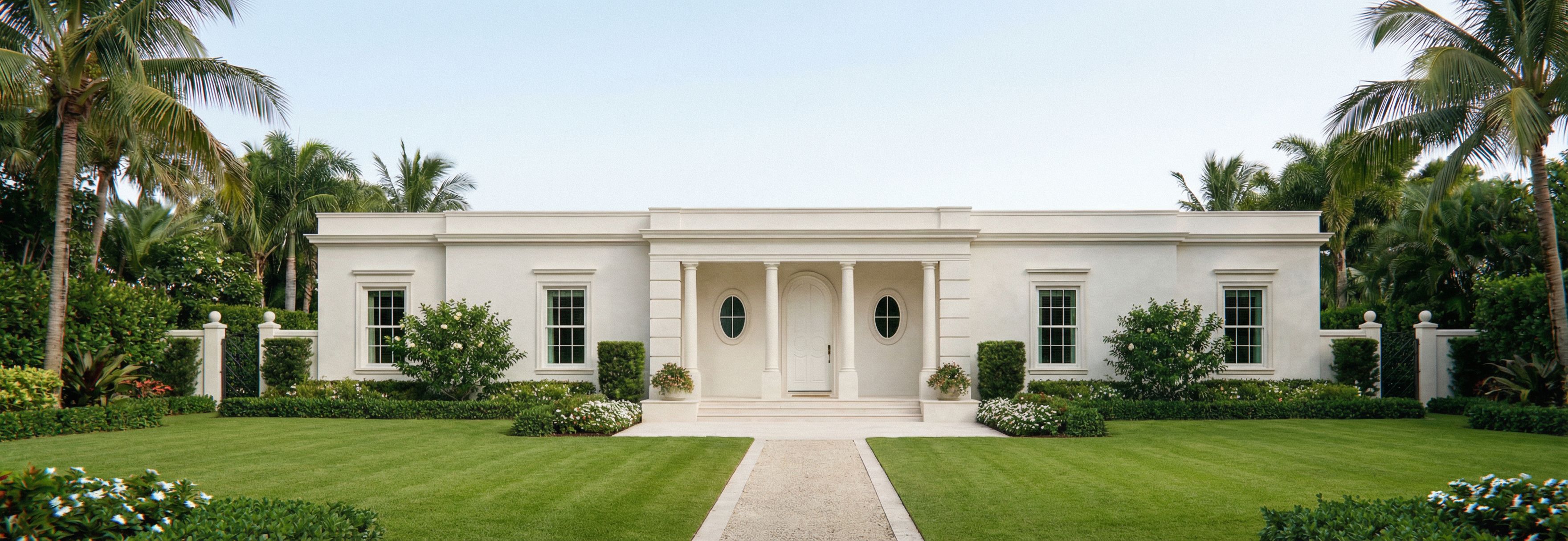 Promptchange only what i say. can you remove teh roof. also i want to see less driveway. it should look liek an elegant opalm beach front yard , keep exact camera angle