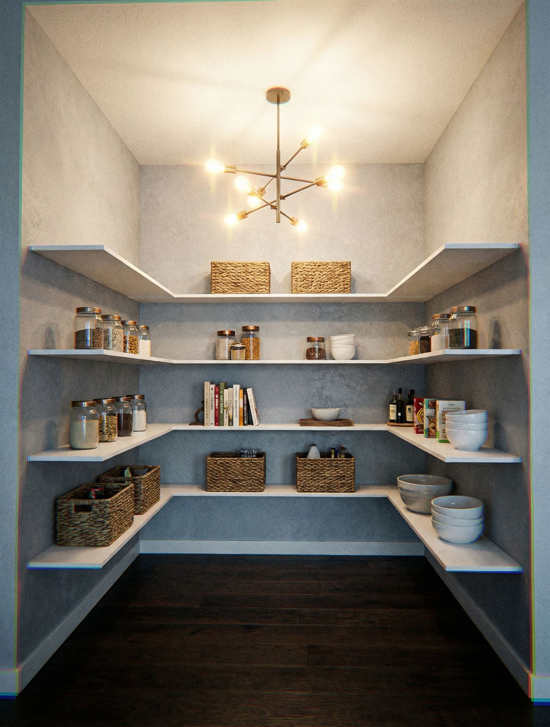 Make floating shelves white with a more modern light fixture for this walk-in pantry., keep exact camera angle