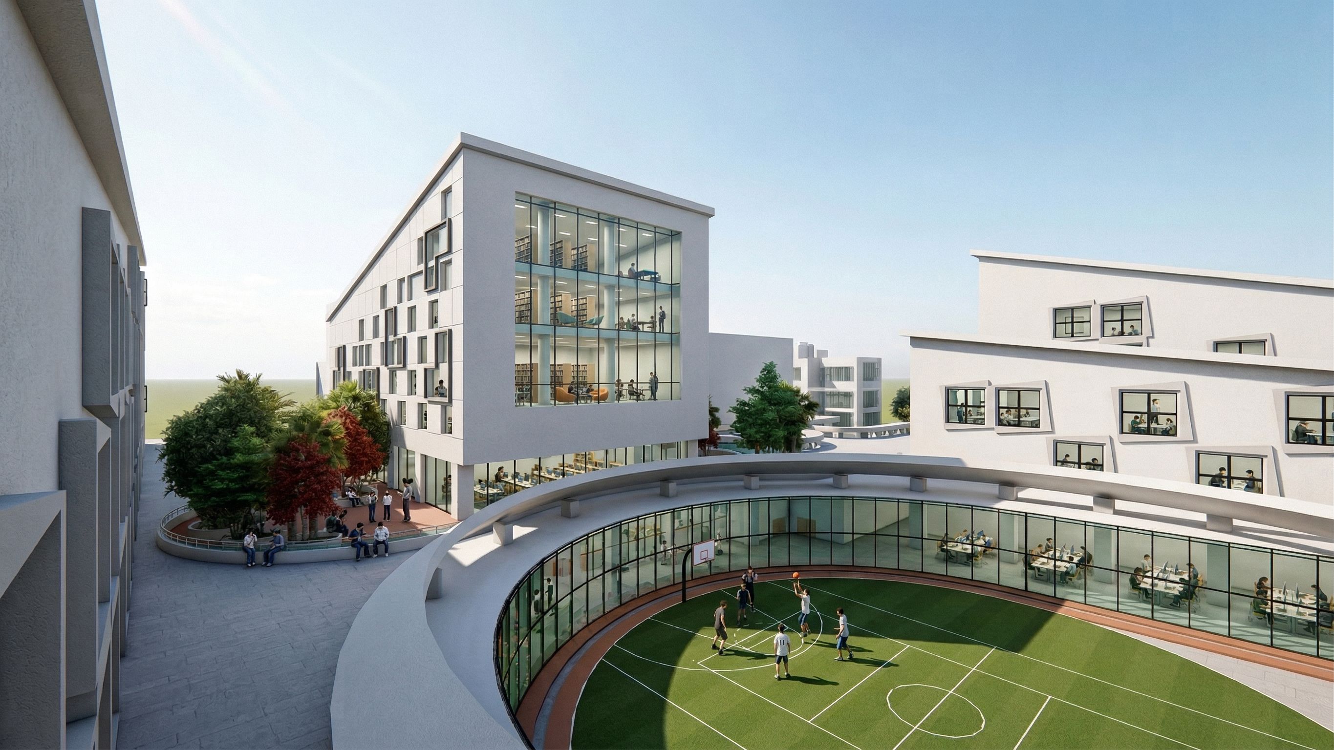 Promptit is the exterior 0f a modern Syrian (ARAB) school and it shows the library and computer building and the curtain wall show the four levels don't add surroundings to the school add students in the library and under the trees only and in the classrooms and students playing in the sport court and edit the columns modeling, keep exact camera angle