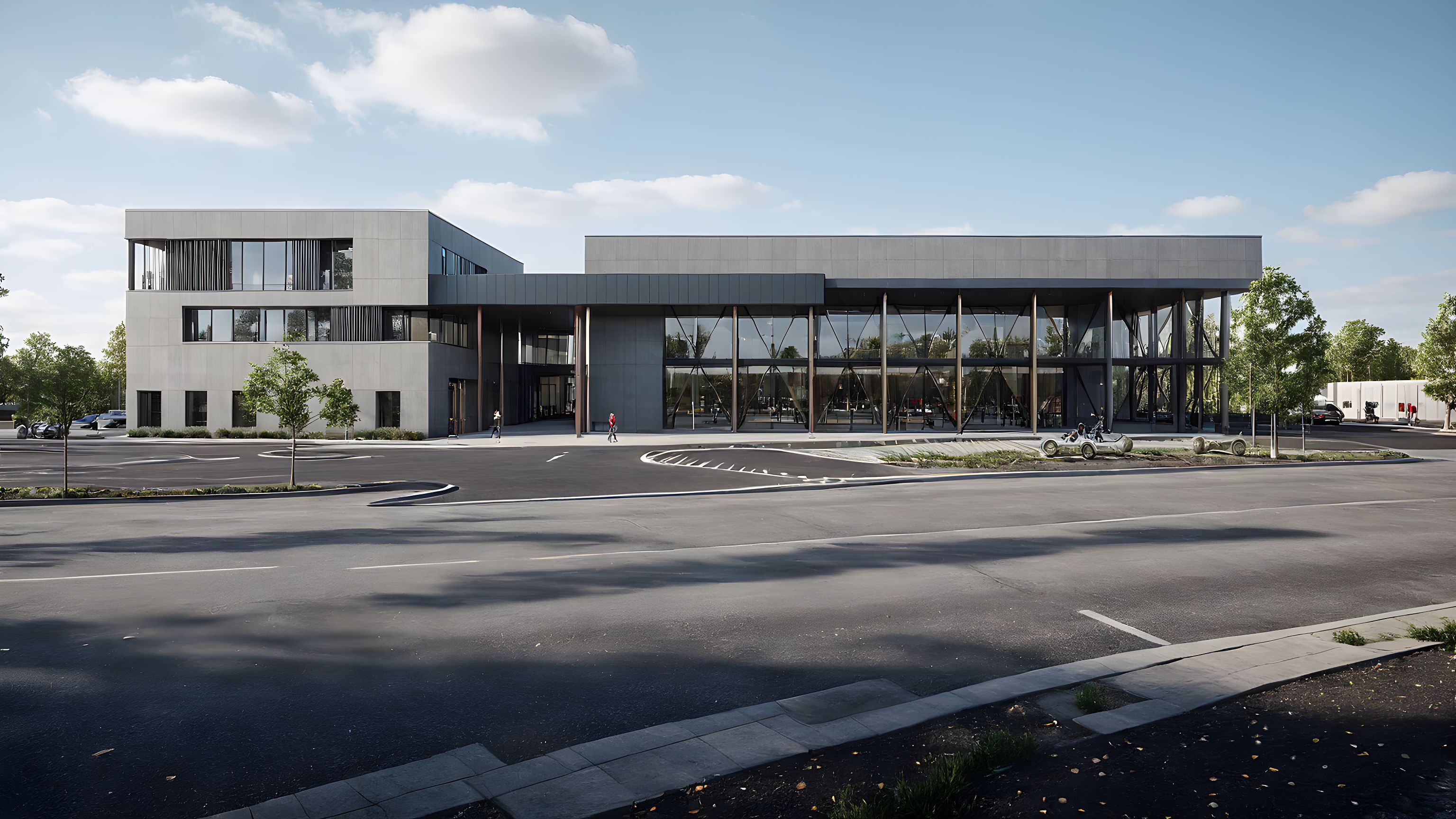 Promptexhibition venue, gray facades, road with few trees in the foreground, several people in front of the building, parking lot in front of the building, children's playground on the right