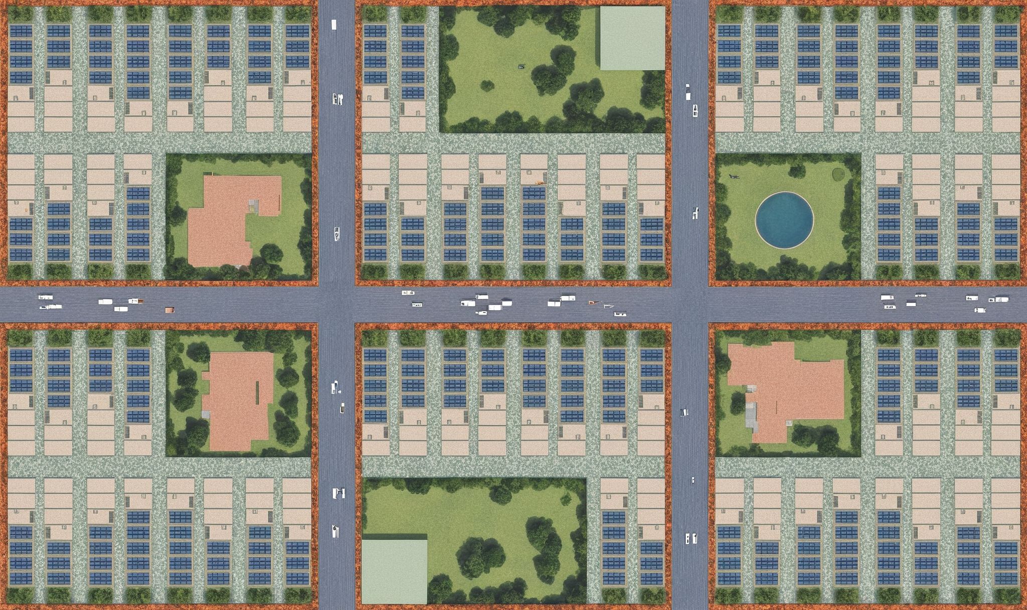Aerial view master plan of a sustainable low-income village designed with a grid-inspired layout. The village features modular, repetitive residential units constructed from eco-friendly materials such Compressed Earth Blocks CEB with Steel Frame with white paint. All houses include flat rooftops with integrated photovoltaic solar panels. The housing blocks are arranged in clusters with clear pedestrian circulation, allowing for future horizontal or vertical expansion. Key public facilities are color-coded for clarity within the master plan: •	Red: Supermarket •	Blue: Primary School •	Green: Public Park •	Orange: Health Center •	Yellow: Central Mosque with minaret •	Pink: Sports Club The master plan includes: •	Clearly defined street hierarchy primary roads, secondary roads, and alleys •	Continuous sidewalks on both sides of the roads •	Shaded pedestrian paths and bike lanes connecting all zones •	A dedicated agricultural zone with farming plots and greenhouses at the village periphery •	Evenly distributed public green spaces and seating zones across residential clusters The rendering should reflect a lively daytime setting, with people moving through streets, walking, cycling, gathering in parks, and accessing facilities. Use soft shadows and a warm arid-to-temperate color palette. Highlight the contrast between the color-coded public buildings and the earth-toned residential units for visual clarity.