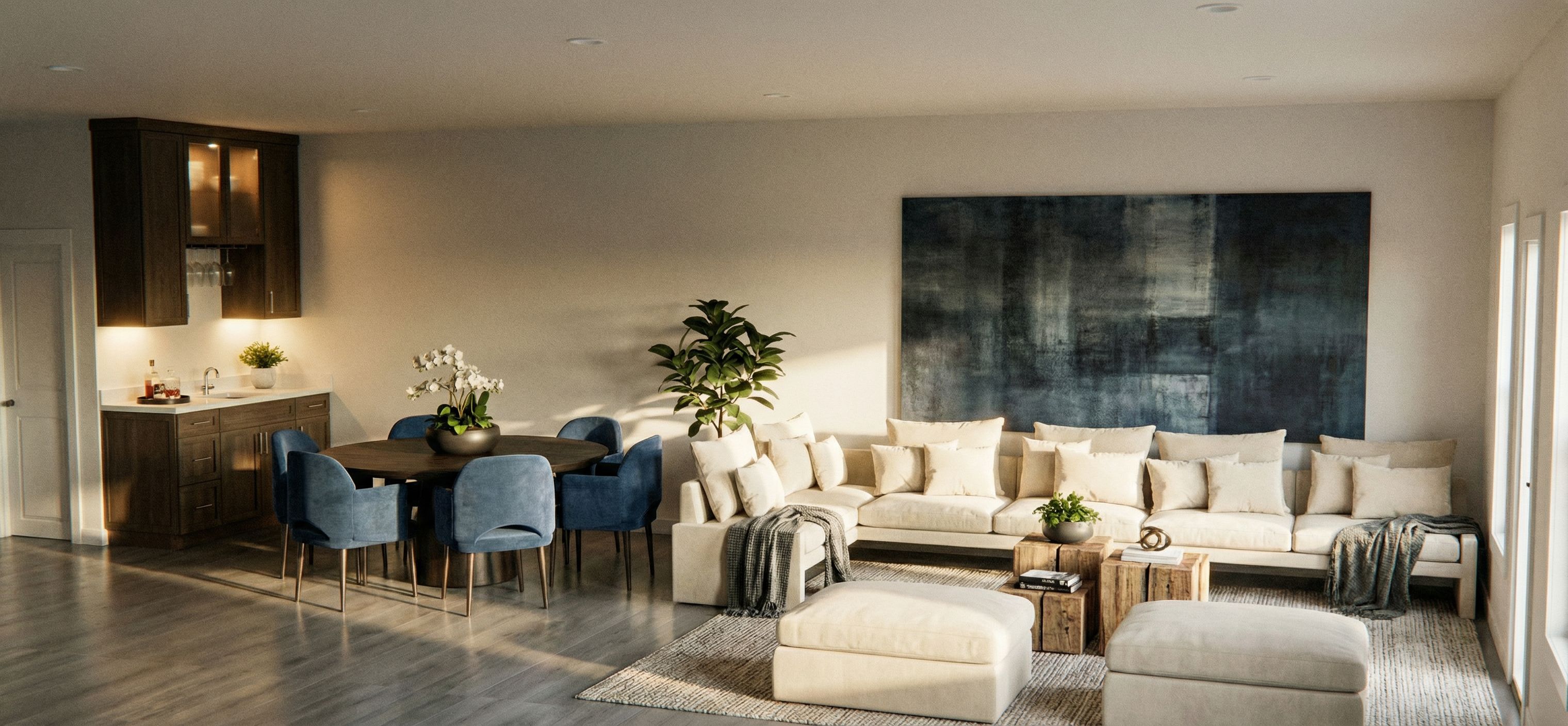 Photo of a modern basement living space featuring an open-plan design with a cozy seating area and wood block table. Highlight the smooth grey wooden floors, oversized sectional sofa with plush cushions, and round games table surrounded by upholstered chairs. Emphasize the warm natural lighting from windows, massive wall art behind the couch that ties the space togther, Capture the perspective from a corner angle to showcase the room's layout, using a wide-angle lens to create depth and a welcoming atmosphere. Include rich textures of fabrics and wood in the design elements for a lifelike render. add rugs, decor, furniture, keep exact camera angle