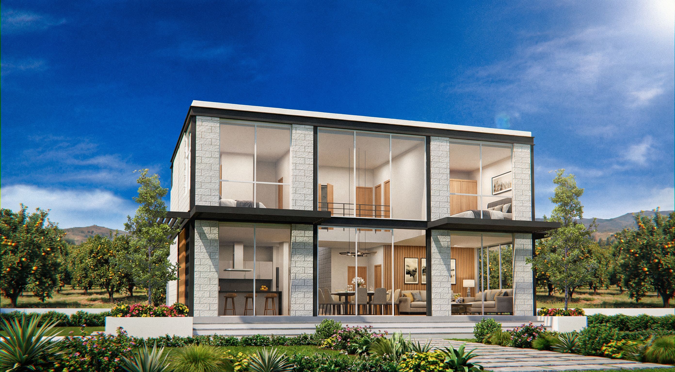 PromptPhotograph of a contemporary residential building with expansive glass walls and a minimalist facade of industrial-style white brick. On the ground floor, to the right is a living room, the central area is a double-height dining room, and to the left are the kitchen bar and the entrance to the house. On the upper floor, to the right is a bedroom and to the left another bedroom. Highlight the elegant lines, the textures of the natural stone, and the integrated vegetation with planters filled with vibrant flowers. Located in a rural setting, with no other buildings nearby, the building features fruit trees in the background and a landscaped area in front.