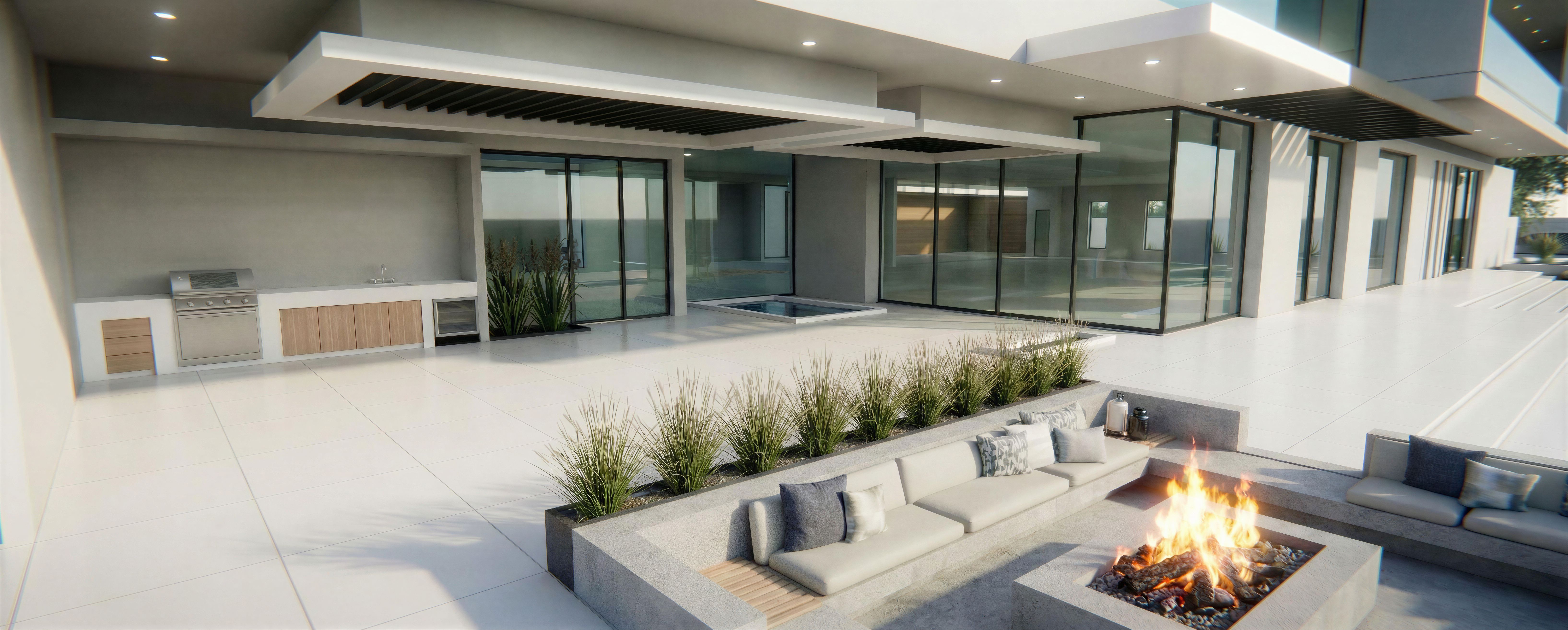 colocar el piso del firepit en el mismo maerial del firepit. mostra llamas encendidas en el centro del fire pit, de resto dejarlo todo como esta, keep exact camera angle