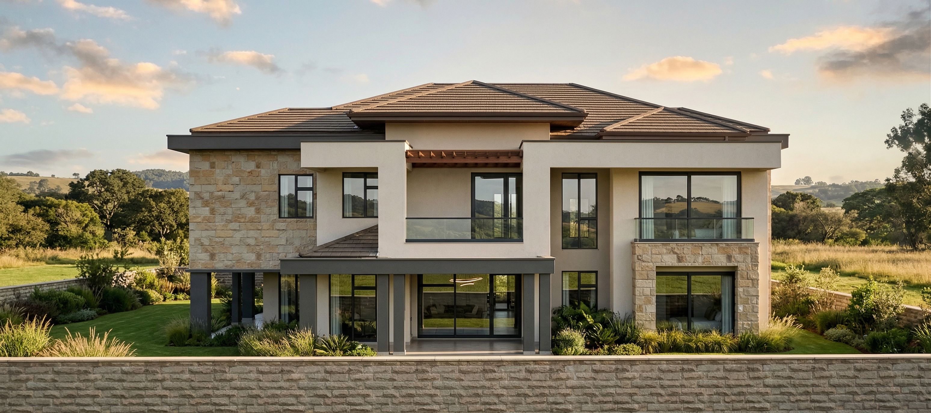Photo of a modern residential building featuring expansive glass walls and elegant stone detailing. The design incorporates sleek columns and a prominent roofline. Surrounding the structure is a lush green lawn. The scene is illuminated by soft afternoon sunlight, casting gentle shadows across the facade. A low-angle perspective highlights the building's striking features, while a wide-angle view captures the impressive scale and surrounding environment, emphasizing the harmonious balance between nature and architecture. No opening on the perimeter wall, keep exact camera angle