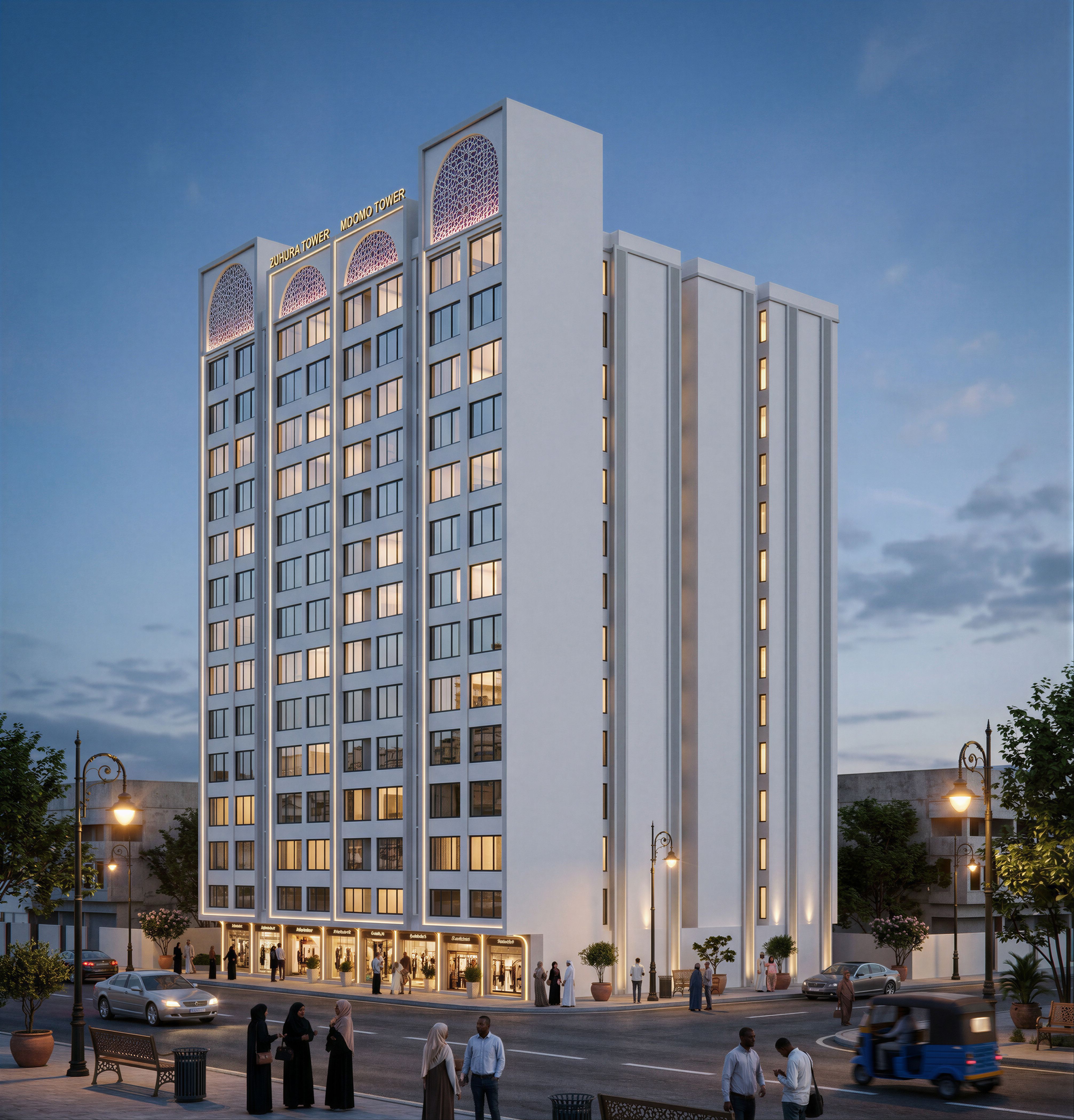 EnhancedPromptPerspective of a building with ground as commercial space with shops and the rest apartment floors. Make glass clear, realistic and reflective. Use spot lights , street lights and rope lights in the building. Use WHITE wall master on the building and make mouldings and , beams and columns a slightly LIGHTER shade of GREY. introduce people of somalia and African origin on the street. MAKE MOULDINGS AROUND OPENINGS, WINDOWS AND ARCHES. MAKE LATTICE WORK WHITE IN COLOUR.MAKE IMAGE HIGH RESOLUTION 8K. MAINTAIN CAMERA ANGLE AND THE NUMBER OF LEVELS IN THE ORIGINAL IMAGE. THE NAMES ON THE BUILDING IS "ZUHURA TOWER" AND "MDOMO TOWER" RESPECTIVELY. TURN ON THE LIGHTS IN THE BUILDING. REMOVE BALCONIES. MAINTAIN CAMERA ANGLE AND ORIGINAL DESIGN., keep exact camera angle