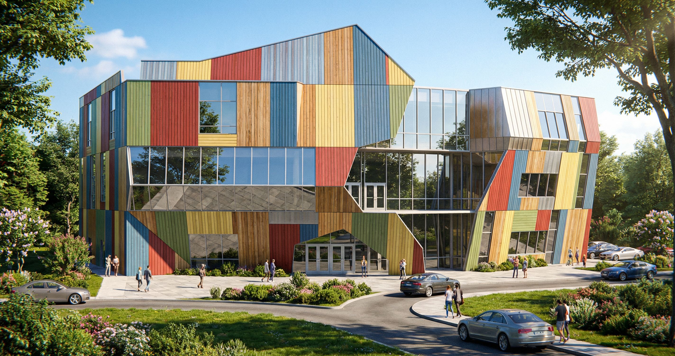 random colorful siding, more glass windows