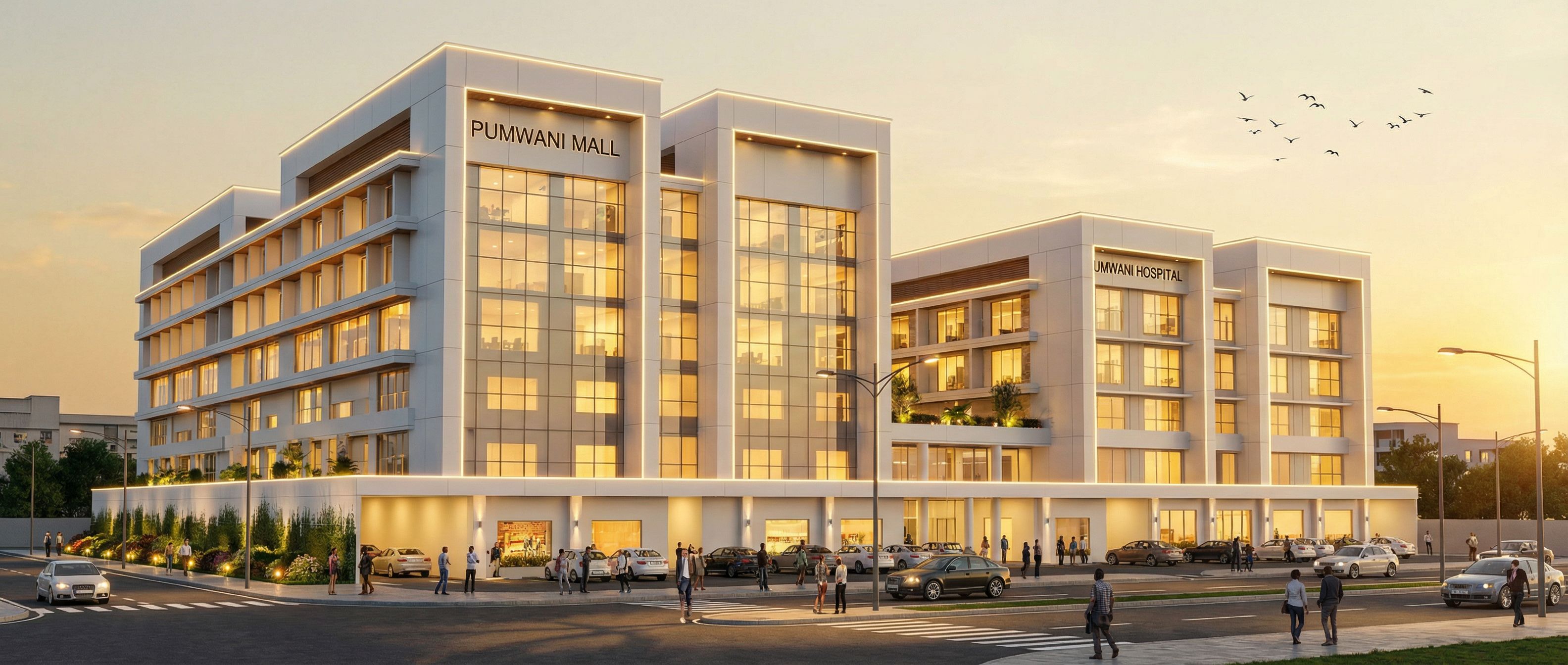 architectural exterior rendering, render this photo into photorealistic rendering, WARM SUMMER MORNING WITH LIGHTS TURNED ON IN THE BUILDING. INCLUDE STREET LIGHTS, ROPE LIGHTING ON THE BUILDING AND GARDEN LIHGTS. A COMMERCIAL STREET SCAPE WITH LOTS OF PEOPLE AND CARS. WRITE THE GRAPHICS "PUMWANI MALL MALL" ON THE FIRST BUILDING AND "PUMWANI HOSPITAL" ON THE SECOND BUILDING. SOME BIRDS IN THE SKY. MAKE THE BUILDING WHITE WITH ALLUMINIUM COMPOSITE PANELS FINISHING., keep exact camera angle, high quality, professional, detailed scene
