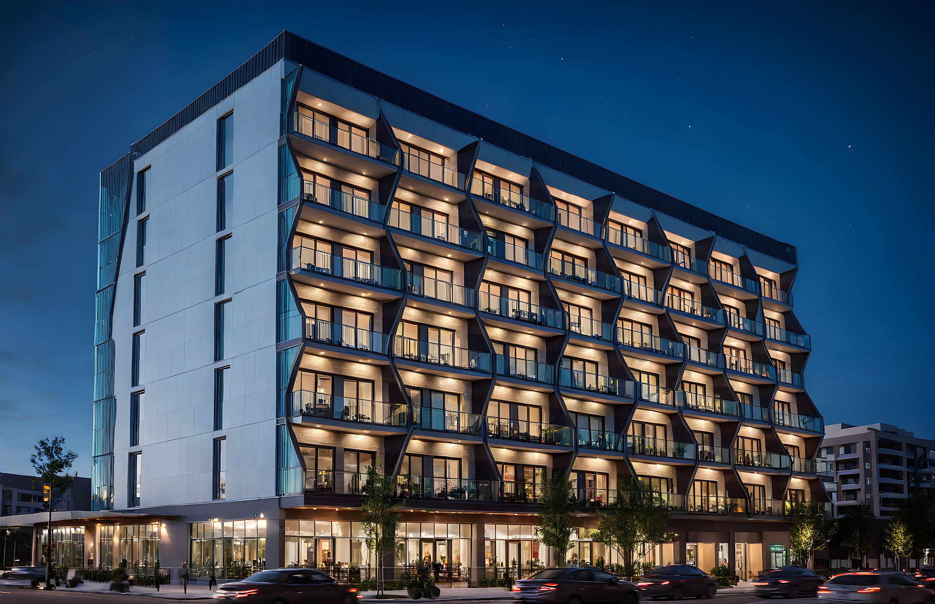 Let it be nighttime with stars. The building's exterior has been designed with LED lighting. The building, distinguished by its zigzag balcony designs, is a modern multifamily residential building. This photograph depicts a building constructed from single-pane balcony glazing and large glass windows. The building features a smooth, textured façade that combines concrete and colorful accents. It is surrounded by an urban setting where pedestrians and vehicles fill the streets. The building was shot from a low angle, showcasing its height and inviting perspective. A wide-angle lens accentuates the surrounding cityscape, providing a holistic view of the vibrant neighborhood.