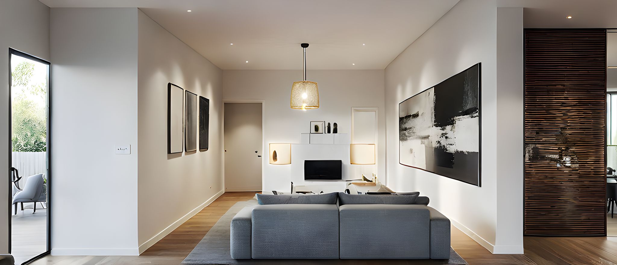 PromptPhoto of a modern living room interior featuring sleek, minimalist design. Focus on the soft gray fabric of the sofa, textural interplay of wooden flooring, and the woven pendant light that casts warm highlights. The white walls create a bright atmosphere, complemented by an abstract black-and-white artwork creating a striking focal point. Capture a wide-angle perspective from the sofa's viewpoint, showcasing the open space and inviting ambiance, with soft, diffused natural light flooding in from an unseen window, enhancing the room's modern aesthetic.
