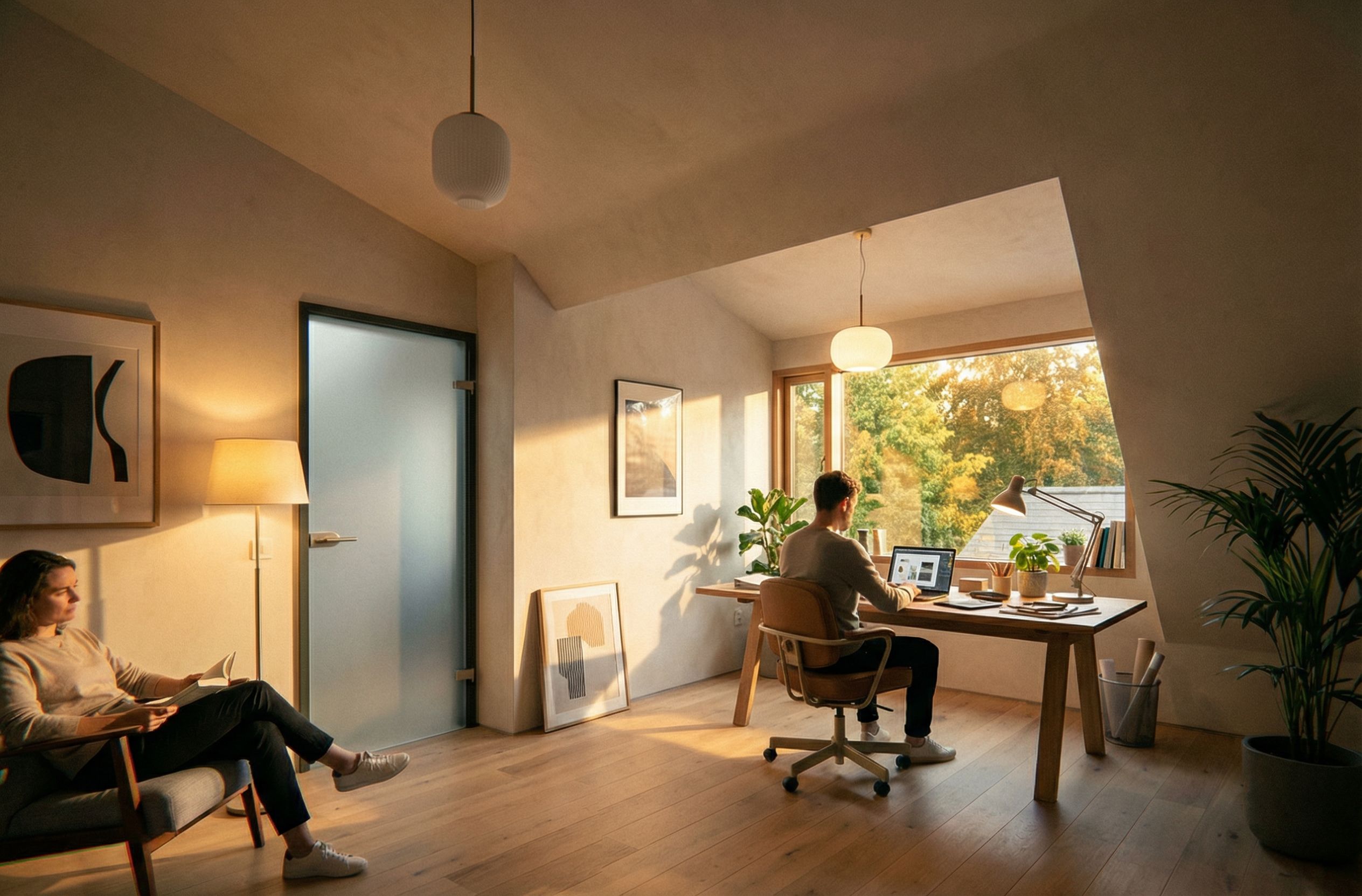 Promptcontemporary interior workspace under dormer window with trees outside and bright finishes, keep exact camera angle