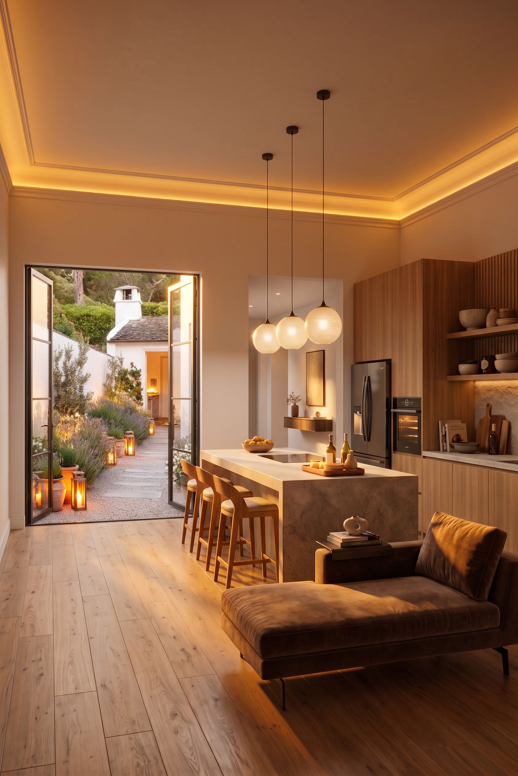 PromptAbrir um corredor no final da cozinha. Alargar um pouco a porta de caesso ao jardim. baixar o teco 50cm , keep exact camera angle