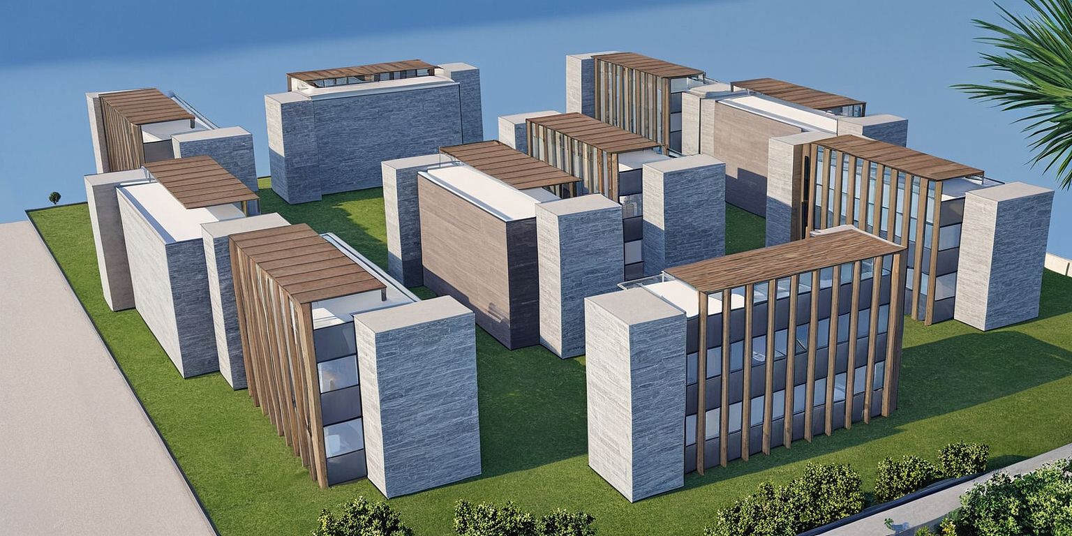 PromptPhoto of a modern multi-family residential complex featuring sleek, vertical structures with contrasting materials. Emphasize the smooth concrete facades juxtaposed with warm wooden elements, and the distinctive slanted red roofs. The setting is an urban landscape, surrounded by green spaces and nearby contemporary buildings. Late afternoon sunlight casts dynamic shadows enhancing architectural details. Perspective from above, using a wide-angle lens to capture the layout and relationships between buildings, showcasing the interplay of light and space.