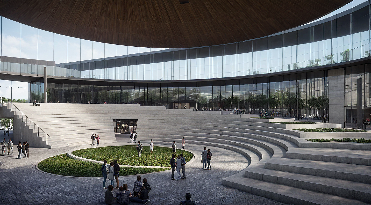 PromptRender and design the facade of this civil building (inside a museum, this is a covered amphitheater) in a social district in the center of the city. Add some cars on the road and populate it with people. Also add greenery where possible. add some people seating on the stepped area.