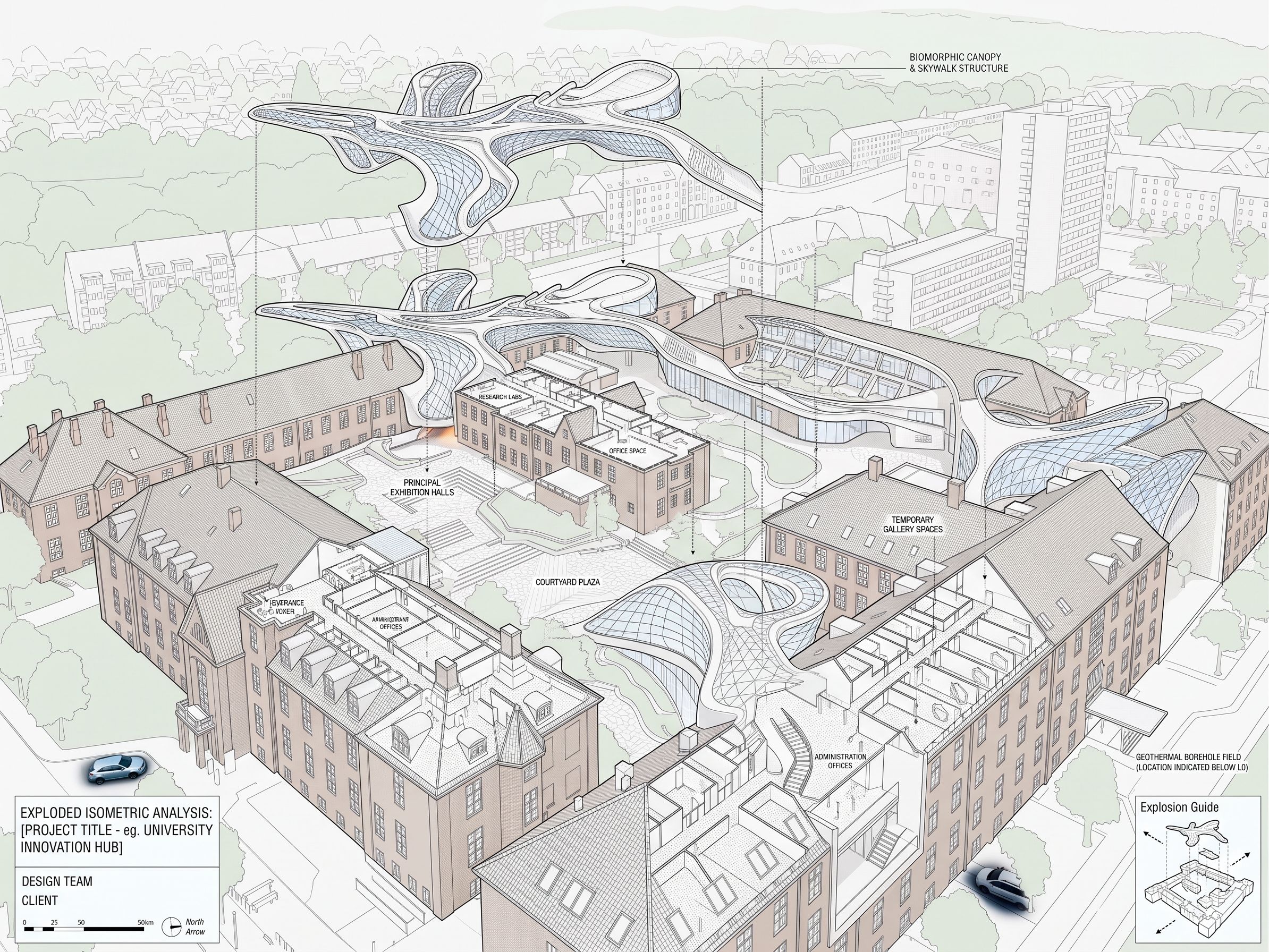 PromptCreate an exploded isometric view of this building complex. Section each level containing a row of windows on each floor and create drawing slices separated by white spaces; arrange the isometric blocks in height, one above the other. The last block will be the white ergonomic glass roof. , keep exact camera angle