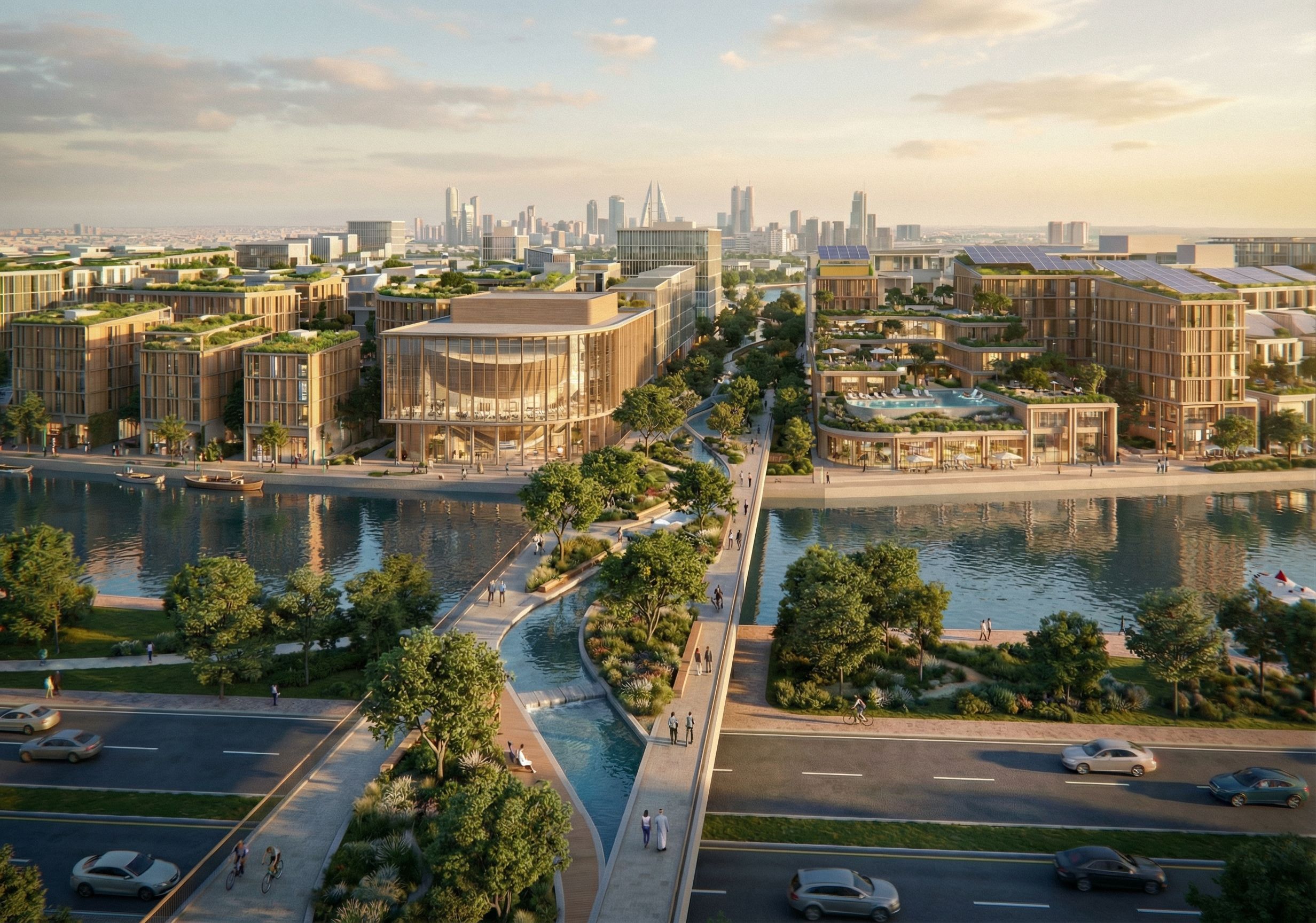 PromptAdd theatre and Wellness centre to right of bridge. set in bahrain, keep exact camera angle