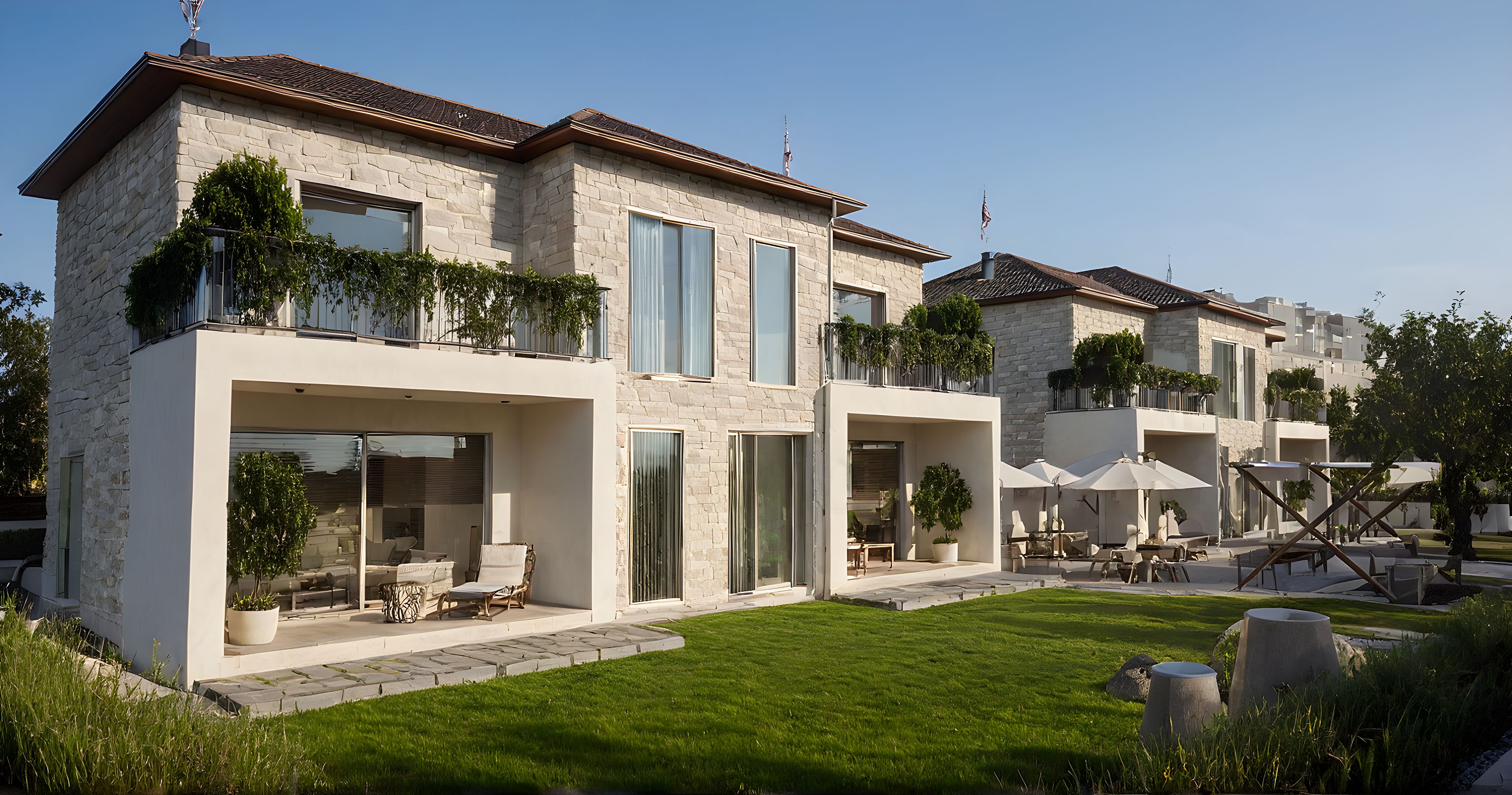 Photo of contemporary residential buildings with white stone and stucco finishes, featuring large glass windows and wooden slats. Set in a landscaped garden with well-maintained grass, outdoor seating, and shade umbrellas. The lighting is warm and natural, casting soft shadows during the late afternoon. Captured from a low angle to emphasize the structure’s height and surrounding greenery, utilizing a wide-angle lens for a dynamic perspective that showcases the inviting atmosphere.
