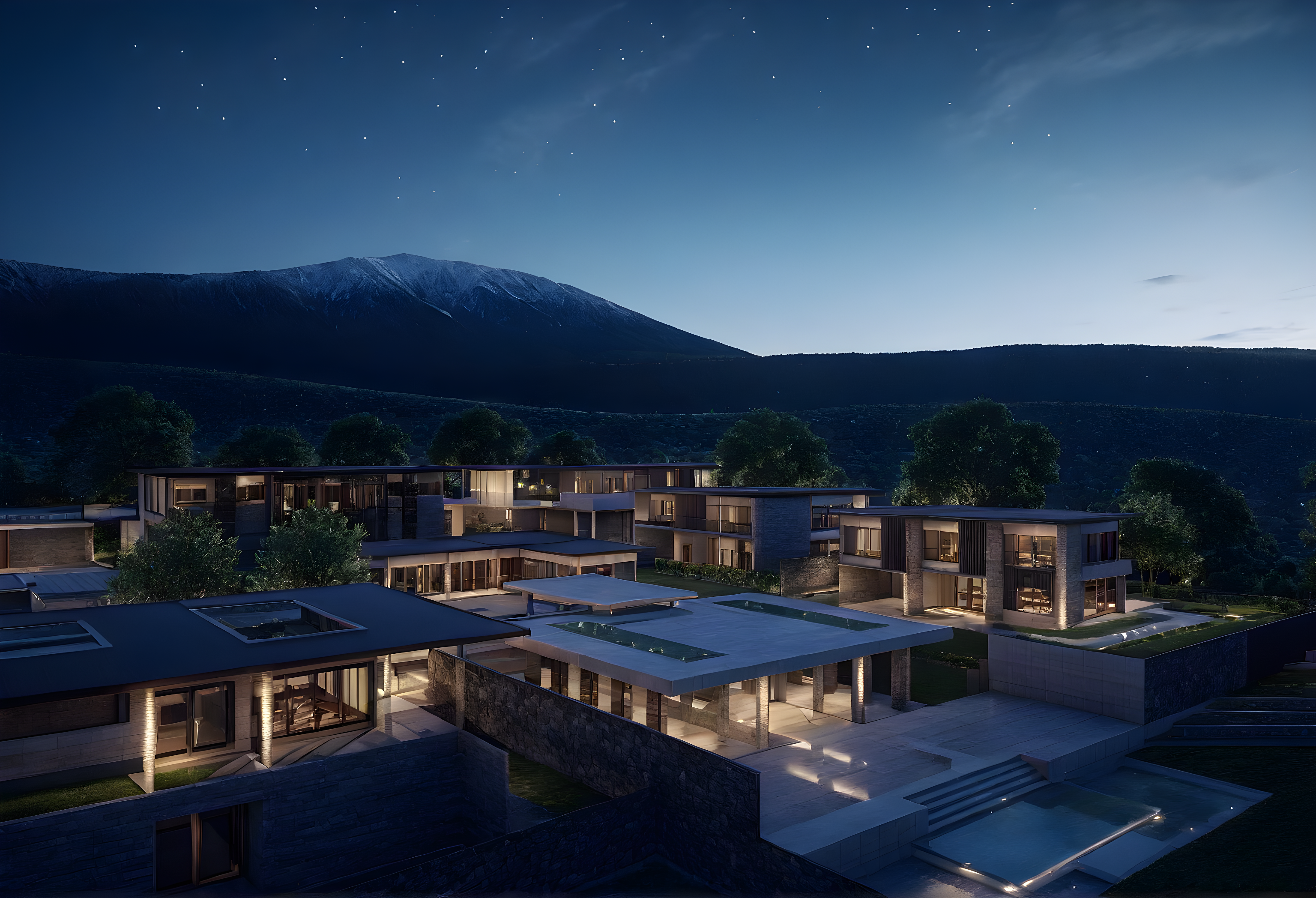 render as a night time sky is dark but star is all over the sky every window have warm light on focus or star sky night and mountain background make sky all dark only see star